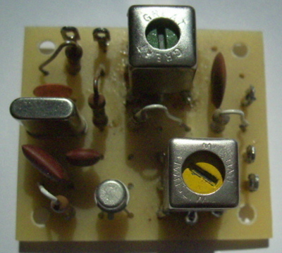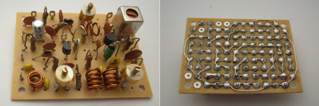 Letztendlich gelangte ich für den Eingangsteil meines Empfängers zur gezeigten Schaltung, indem ich den UKW-Teil aus einem billigen Radio aus Fernost mit besseren Transistoren nachbaute und für das 2m-Band umdimensionierte. Wie auf den Fotos gezeigt, gelang mir ein weiterer Aufbau (mit 2xBF959) sogar auf einer Lochrasterplatte (Rastermaß 5,08mm). Dank durchdachter Verdrahtung und 90°-Winkeln der Spulen zueinander funktioniert die Schaltung auch so recht ordentlich. Sie zeigt keinerlei Schwingneigung. Der richtige Abgleich der Zwischenkreise ist mit einem AM-ZF-Teil möglich, indem die beiden Trimmer bei angeschlossener Antenne auf maximales Rauschen eingestellt werden. Zuvor muss der Oszillator-Kreis so abgeglichen werden, dass sich Frequenzen zwischen 133,3 und 135,3 MHz einstellen lassen.