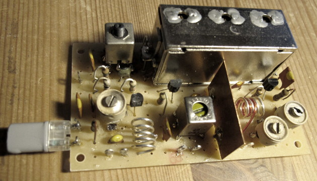 Jenes Gerät war einschließlich UKW-Tuner, ähnlich wie auf dem nebenstehenden Foto, auf einer Platine aufgebaut. Obwohl hier die Eingangsschaltung mit HF-Vorstufe und selbstschwingender Mischstufe wesentlich einfacher konstruiert war, waren die Empfangs- Ergebnisse nach Austausch des HF-Vorstufen-Transistors durch einen guten HF-Typ mit denen des Multiband-Radios durchaus vergleichbar. Dadurch zu weiteren Versuchen motiviert, baute ich ein japanisches Autoradio mit Variometer-Abstimmung und getrenntem Oszillator um. Wohl vor allem wegen des HF-gerechteren Aufbaus war der Empfang damit, insbesondere was das Durchschlagen von UKW-Rundfunksendern und sonstige Fehlempfangsstellen anbetraf, sogar spürbar besser, als mit dem Multiband-Radio. |