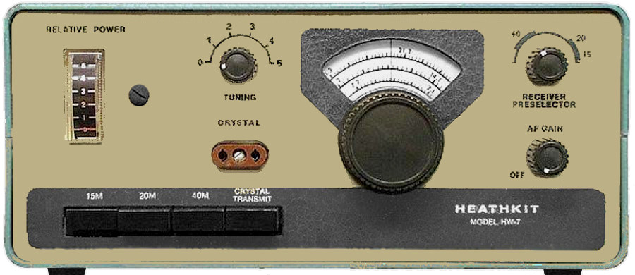 Mitte der 1970er Jahre kam von Heathkit der Bausatz für einen einfachen und kompakten KW-Transceiver heraus, der immerhin den Betrieb auf drei Bändern ermöglichte, der aber lediglich für Telegrafie ausgelegt war. Eine Besonderheit war damals, dass hier ein Direktmisch-Empfänger zum Einsatz kam. Einen reiner Empfänger dieser Bauart ist der hier von mir an anderer Stelle vorgestellte DL0VV-Empfänger, der etwa Anfang der 1970er Jahre entwickelt wurde. Bei diesem Empfangsprinzip wird der Produktdetektor direkt mit einem auf der eingestellten Empfangs-Frequenz arbeitenden VFO betrieben, so dass die Selektion nur noch NF-seitig mittels eines Tiefpasses erfolgt. Auf diese Weise lassen sich CW- und SSB-Signale in guter Qualität empfangen, es gibt jedoch keine Unterdrückung im Bereich des unerwünschten Seitenbandes. Bei CW lässt sich ein dort vorhandenes störendes Signal gegebenenfalls auf Schwebungsnull abstimmen. Dem geübten Telegrafisten gelingt es ansonsten auch, mittels seines "selektiven Gehörs" die Gegenstation anhand der Tonhöhe herauszuhören. Zu Zeiten, als Audionempfänger das Standardgerät in der Amateurfunkstation waren, machte man es ohnehin nur so. Übrigens verwendete man bei den später herausgekommenen Heathkit CW-Transceivern HW-8 und HW-9 keinen Direktmisch-Empfänger mehr. Diese Tatsache beschert dem HW-7 heute gewissermaßen einen Kultstatus, so dass selbst restaurierungsbedürftige Geräte oft Preise erzielen, für die man auch einen gebrauchten Fünfband-SSB-Transceiver bekommen kann.