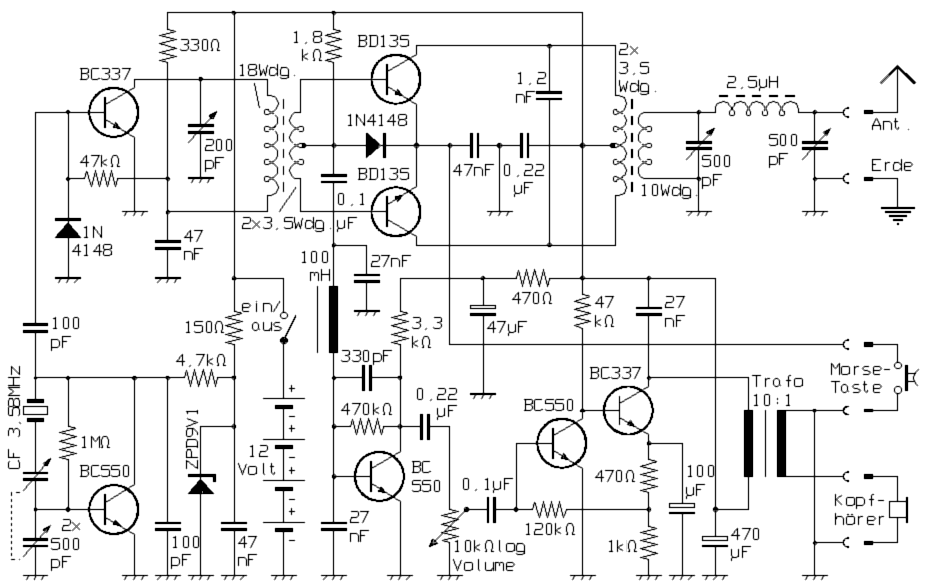 Auch bei der hier gezeigten Schaltung eines kleinen Transceivers für den Telegrafiebetrieb arbeitet der Empfänger als Direktmischer. Die Mischung erfolgt hier aber nicht mit einem Dualgate-MOSFET, sondern an den Diodenstrecken der Endtransistoren des Senders. Weil die Sender-Endstufe in Gegentakt-Schaltung arbeitet, ergibt sich so für den Empfangsbetrieb ein Mischer, der ebenfalls im Gegentakt arbeitet. Das hat den Vorteil, dass besonders kräftig einfallende Rundfunksender, die in der Nähe des Amateurfunk-Bereiches arbeiten, den Empfang kaum noch stören können. Der Oszillator arbeitet mit einem Keramik-Resonator und kann in der gezeigten Anordnung etwa im Bereich von 3,5 bis 3,6 MHz abgestimmt werden. Weil das Gerät für das 40m-Band ausgelegt ist, folgt auf den Oszillator ein Frequenz-Verdoppler. Folglich kann das Gerät im gesamten 40m-Band von 7,0 bis 7,2 MHz abgestimmt werden. Durch eine weitere Vervielfacherstufe, die wahlweise als Verdoppler oder als Verdreifacher arbeitet, wäre ein Dreiband-Transceiver denkbar, mit dem zusätzlich auch im 20m- und im 15m-Band gearbeitet werden könnte. Ein- und Ausgangskreise der Endstufe müssen dafür selbstverständlich entsprechend umgeschaltet werden.