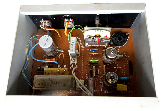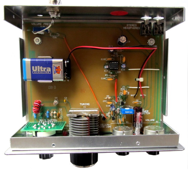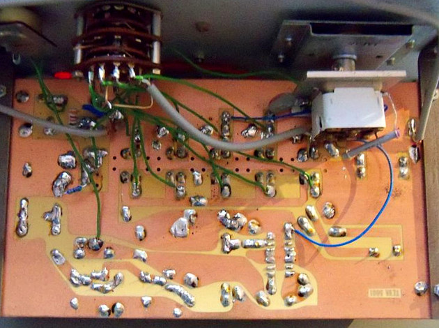 Der Aufbau der gesamten Schaltung, einschließlich des HF-Spulensatzes und des Netzteils, erfolgte auf einer gedruckten Leiterplatte, was die Verdrahtung und somit auch den gesamten Aufbau erheblich vereinfachte. Die komplett bestückte und im Gerät montierte Platine ist auf dem als nächstes abgebildeten Foto zu erkennen. Auch hier zeigt sich, dass die umschaltbaren Spulen für die umschaltbaren fünf Wellenbereiche einen großen Anteil des Platzes benötigen.