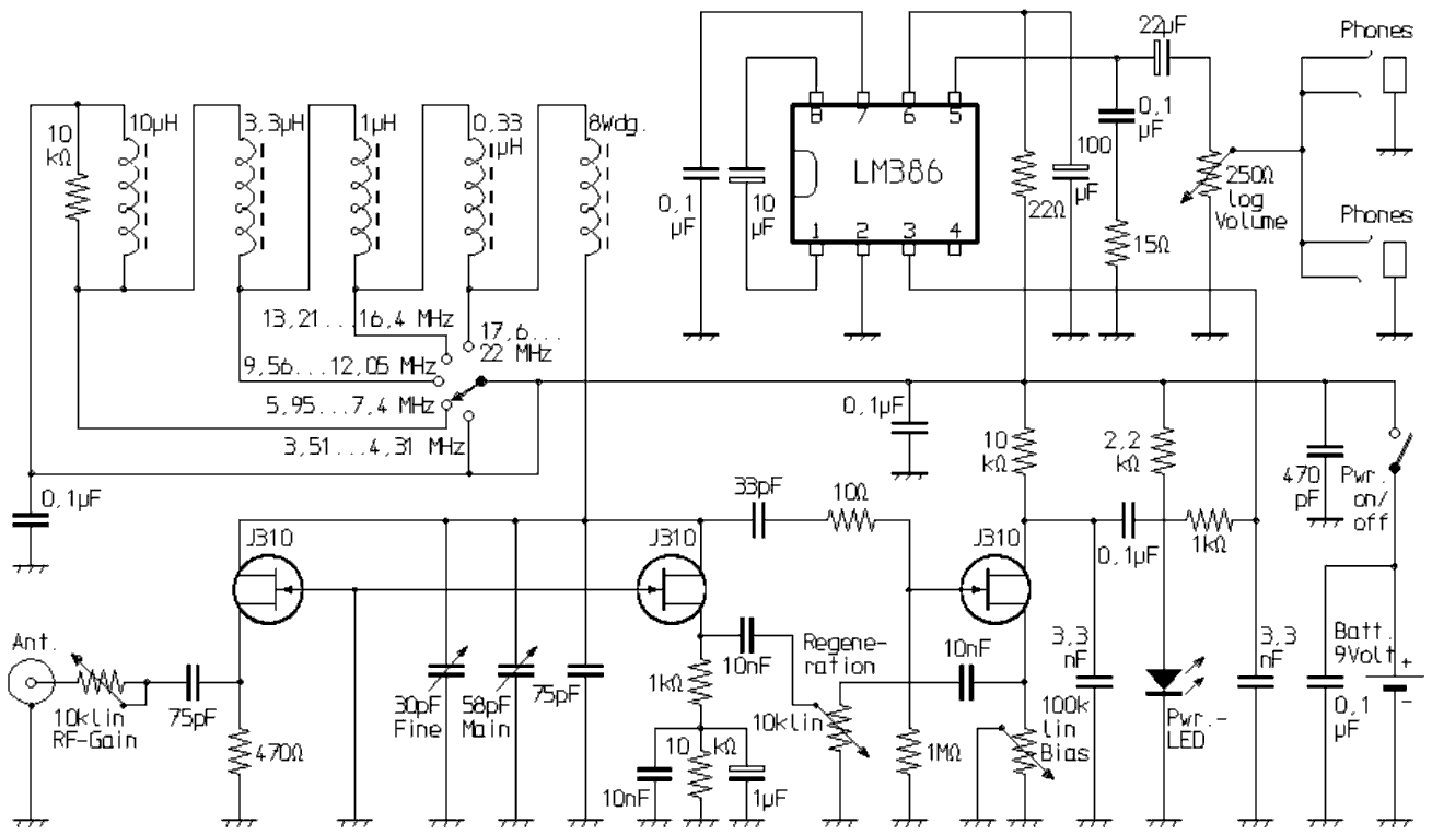 Hier der Schaltplan des gut funktionierenden Geradeaus-Empfängers MFJ-8100 von MFJ Enterprises. Die Schaltung bietet viele Anregungen für eigene Experimente. Der HF-Teil arbeitet mit drei Feldeffekt-Transistoren (FET) des Typs J310, der NF-Teil mit dem sehr verbreiteten integrierten Schaltkreis LM386. Sehr nachbaufreundlich ist die Verwendung von Fertigspulen für die unteren vier Frequenzbereiche. Nur für den obersten Bereich muss eine kleine Rinkernspule mit 8 Windungen gewickelt werden.