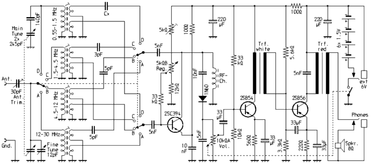 Die Schaltung hatte zum Erscheinungszeitpunkt - wie seinerzeit viele japanische Produkte - ein eher konservatives Design. So fallen insbesondere die Germanium-Transistoren im NF-Teil auf. Die transformatorische Kopplung ermöglicht beste Leistungs-Anpassung zwischen den Stufen und an den Lautsprecher. Mit der nur zweistufigen Verstärker-Anordnung ist daher dennoch brauchbarer Lautsprecher-Empfang möglich. Die Demodulation bzw. Mischung erfolgt mit einer Germanium-Diode. Eine Oszillator-Schaltung mit Rückkopplung nach Meißner dient der Entdämpfung bzw. der Überlagerung. Im Mittelwellenbereich ist im Originalschaltbild kein Rückkopplungskondensator eingezeichnet. Da der Entdämpfungsregler aber auch hier funktioniert, muss dieser letztlich vorhanden sein. Ich nehme an, die Rückkopplung erfolgt hier über die Schaltkapazität der zum Wellenschalter verlegten Leitungen. Die unbekannte Kapazität ist hier als Cx bezeichnet.