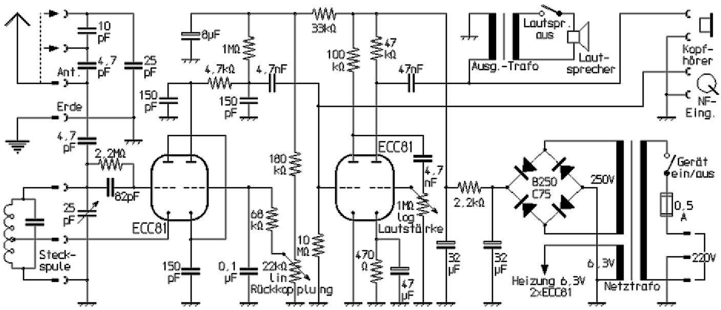 Der zweistufige NF-Teil mit der rechten ECC81 bot genügend Verstärkungsreserve, auch für den Lautsprecher-Empfang schwächerer Stationen. Die linke ECC81 arbeitete als Audion in Kaskodenschaltung. Die Entdämpfung bzw. die Schwingungserzeugung bei angezogener Rückkopplung kam nach Art eines ECO-Oszillators zustande. Die gleichspannungsmäßige Rückkopplungs-Einstellung über eine Arbeitspunktverschiebung des in Gitterbasisschaltung betriebenen Systems der Kaskodestufe hatte nur geringfügige Frequenzverwerfungen zur Folge. Dieses Audion erwies sich bei meinen Versuchen gegenüber einem Pentodenaudion mit einstellbarer Schirmgitter-Spannung als überlegen. Der Rückkopplungseinsatz war angenehm weich, die Empfindlichkeit sehr gut. Durch die drei Antennenanschlüsse konnte die Ankopplung stets gut an die Empfangssituation bzw. an die vorhandene Antenne angepasst werden. Der obere Antennenanschluss eignete sich für längere, der untere für kürzere Antennen besser. Die kleinere Empfangslautstärke bei loserer Ankopplung hatte weniger Verzerrungen durch Synchronisation beim SSB-Empfang zur Folge und ließ sich durch weiter aufgedrehte Lautstärke gut ausgleichen.