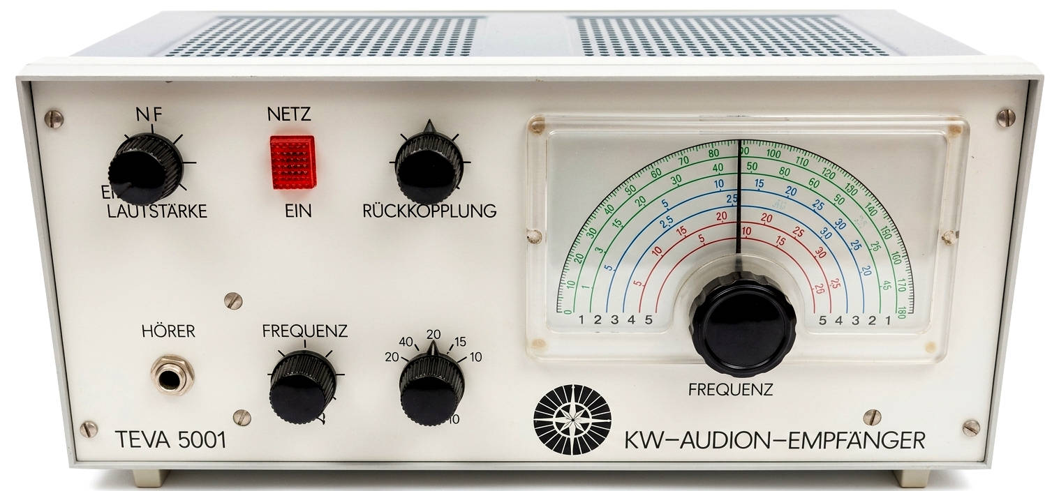 Nach dem erfolgreichen Aufbau meines 0-V-1-Empfänger mit einer Röhre ECC81 suchte ich nach geeigneten Schaltungsvorlagen, um ein noch besseres Gerät bauen zu können. Fündig wurde ich nicht etwa in einem Buch, sondern im Katalog der damaligen Firma Technik-Versand aus Bremen, die unter dem Label Teva auch eine Reihe von Amateurfunk-Bausätzen herausgebracht hatte, darunter auch den hier vorgestellten Audion-Empfänger. Die Schaltung machte mir einen nachbausicheren Eindruck. Außerdem wurde sie von einem älteren OM ausdrücklich gelobt: Er hatte ein solches Gerät einmal besessen. Ich machte mich also daran, nach dieser Schaltungsvorlage ein Gerät zu bauen, ohne mir jedoch den Bausatz zu besorgen. Die benötigten Teile hatte ich recht bald aus alten Radios zusammen gesucht.
