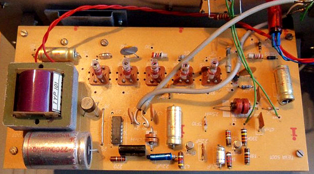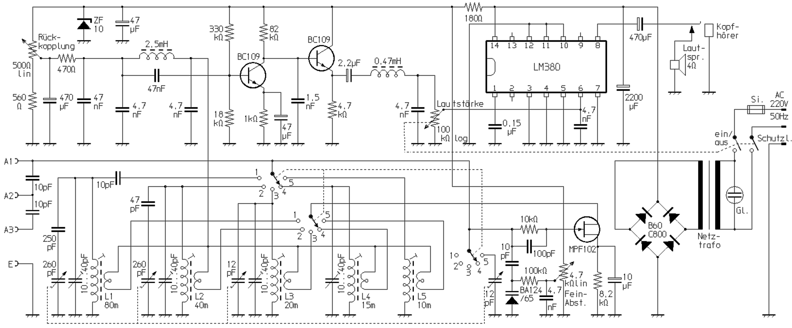 Auch der hiermit vorgestellte Rückkopplungs-Empfänger wurde in den 1970er Jahren von der Firma Technik-Versand in Bremen als Bausatz angeboten. Er war als Einsteigergerät gedacht und erlaubte den Empfang der fünf KW-Amateurbänder im 80m-, 40m-, 20m-, 15m- und 10m-Bereich. Der Schaltplan gliedert sich in ein rückgekoppeltes Audion mit einem Feldeffekt-Transistor, einen zweistufigen transistorisierten NF-Vorverstärker, die NF-Endstufe mit einem IC sowie den Netzteil. Der Bereichswechsel erfolgt bei diesem Gerät durch einen Bandumschalter. Wie man sieht, nimmt die Bereichs-Umschaltung im Schaltplan den größten Raum ein.