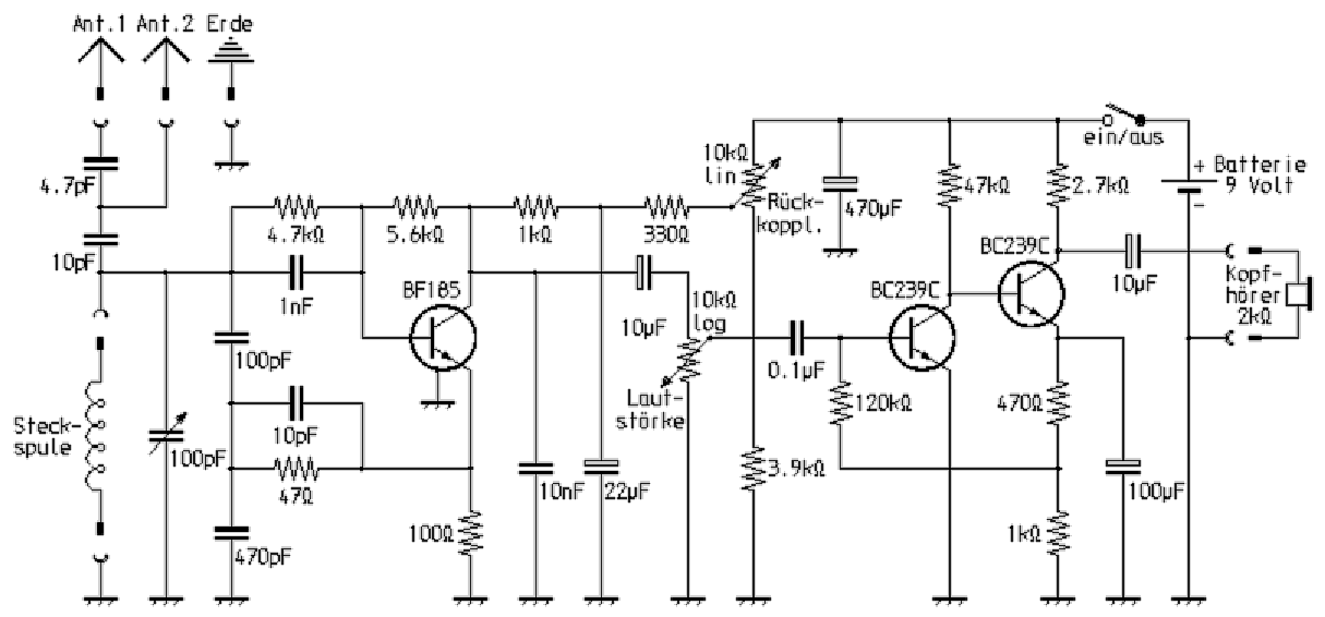 Bei geringem Schaltungsaufwand lassen sich mit Rückkopplungs-Empfängern bekanntlich erstaunliche Ergebnisse erzielen. Im einfachsten Fall arbeiten solche Empfänger mit einer Verstärkerstufe im Eingang, welche eine Halbwelle des hochfrequenten Antennensignals stärker verstärkt als die andere. Es passiert also genau das, was man im Hi-Fi-Verstärker auf keinen Fall haben möchte: Das Signal wird nichtlinear verstärkt, also verzerrt. Davon ist allerdings vor allem das Hochfrequenz-Signal betroffen. Bei richtiger Dimensionierung bewirkt dieser nichtlineare Betrieb in Verbindung mit einem Kondensator, welcher die Hochfrequenz kurzschließt, eine verzerrungsarme Demodulation amplitudenmodulierter Aussendungen.