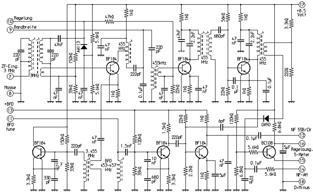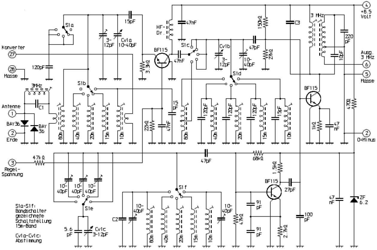 Wie im Schaltbild der Eingangsbaugruppe mit der Bezeichnung HFB3.0 ersichtlich, gliedert sich der HF-Teil in Vorstufe, Oszillator und Mischer. Im wesentlichen weist sie kaum schaltungstechnische Besonderheiten auf. Interessant ist aber die Gestaltung der Bereichsumschaltung unter Berücksichtigung der Anpassung an die Transistor-Impedanzen. Bei mit Röhren bestückten Vorstufensupern musste dies nicht beachtet werden, es genügte die Schwingkreise, Koppelwicklungen für die Antenne und gegebenenfalls für die Oszillator-Rückkopplung umzuschalten. Hier dient nun im Eingangskreis die 80m-Spule zugleich auf allen anderen Bändern als Breitbandübertrager für die Antenne. Der Konvertereingang wirkt über eine Koppelwicklung auf die Kreisspule für 10m. Die Zwischenkreise werden außer beim 80m-Bereich ohne Anzapfung vom hochohmigen Ausgang des in Basis-Schaltung betriebenen Vorstufen-Transistors angesteuert. Die Anpassung an die Mischstufe erfolgt über einen kapazitiven Spannungsteiler (47pF / 100pF). Die Regelspannung ist mit der jener der ersten 455-kHz-ZF-Stufe verbunden. Übrigens gab es diese Baugruppe unter der Bezeichnung HFB1.6 auch mit 1,6-MHz-ZF-Ausgang, so dass ein gewöhnlicher Mittelwellen-Rundfunkempfänger als Nachsetzer bzw. als ZF-Teil dienen konnte.