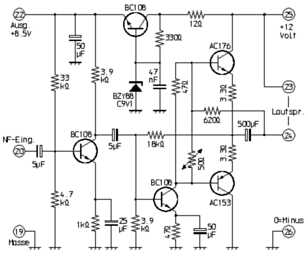 Dem AM-Demodulator folgt der von Semco damals gern verwendeter Regelverstärker, durch den eine recht wirksame Verstärkungsregelung erzielt wird. Die dort gewonnene Regelspannung wird über das RF-Gain-Poti den Regelspannungs-Anschlüssen der HF-Vorstufe und der ersten ZF-Stufe zugeführt. Dabei ist auch eine Umschaltung auf Handregelung vorgesehen. Der ebenfalls ohne Quarzsteuerung betriebene BFO für den CW- und den SSB-Empfang wirkt auf einen Produkt-Detektor. Seine Frequenz wird mit dem Seitenbandumschalter wahlweise auf etwas oberhalb oder unterhalb der ZF-Mittenfrequenz gelegt. Die Baugruppe NFB12-9 mit dem NF-Verstärker und der Stabilisierung weist kaum Besonderheiten auf. Lediglich die komplementäre Endstufe ist noch mit Germanium-Transistoren aufgebaut. |