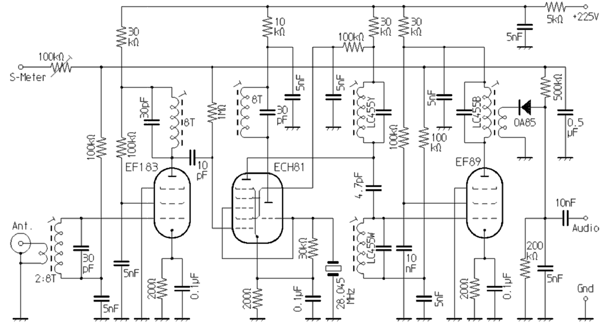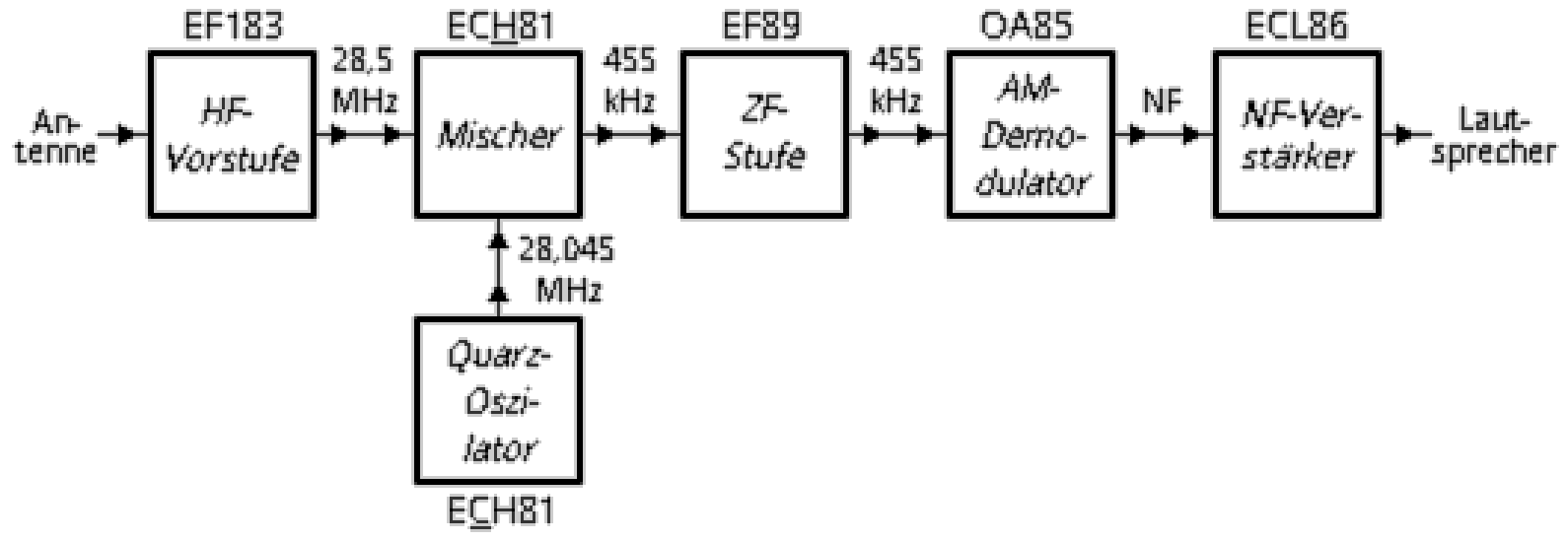 Vor vielen Jahren baute ich mit gewöhnlichen Radio- bzw. Fernsehröhren einen quarzgesteuerten Superhet-Empfänger für das 10m-Band. Er war für die Betriebsart AM ausgelegt. In dieser Betriebsart konnte man im Bereich von 28,5 bis etwa 28,7 MHz seinerzeit oft Stationen hören, die mit umgetrimmten 27-MHz-Funkgeräten arbeiteten. Je nach den Ausbreitungsbedingungen waren hier Nahverkehrs-Runden, Europa-QSOs und mitunter sogar weltweite Funkgespräche zu hören. Durch Einsatz von CB-Quarzen eignete sich der Empfänger nach entsprechendem Abgleich selbstverständlich auch zum Abhören der bei uns in Deutschland damals zugelassenen zwölf CB-Funk-Kanäle.