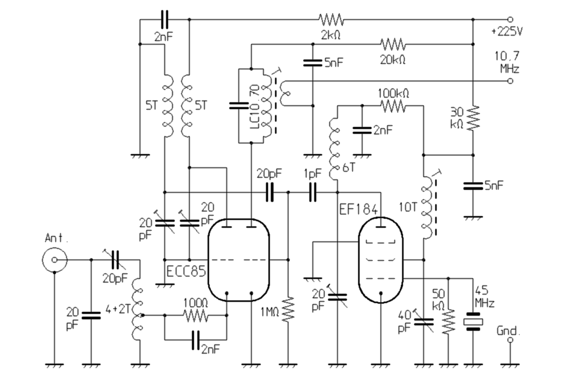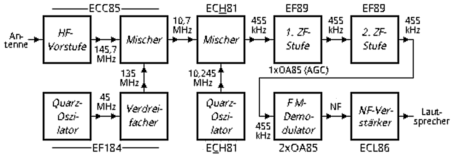 Auf den Erfahrungen meines 10m-Röhrensupers basierend, baute ich später ebenfalls in Röhrentechnik einen quarzgesteuerten Doppelsuperhet-Empfänger für das 2m-Band. Für den Eingangsteil verwendete ich die im UKW-Teil von Röhrenradios überwiegend anzutreffende ECC85. Das eine System arbeitete als HF-Vorstufe in Gitterbasis-Schaltung, während das andere System als additiver Mischer in Kathodenbasis-Schaltung fungierte. Die Verwendung der Eingangsschaltung vom 10m-Empfänger schied aus, da sie im 2m-Gebiet zu großes Rauschen produziert hätte. Mit der ECC85 konnte eine brauchbare Empfindlichkeit erreicht werden. Das an meinem damaligen Standort gut 10 km entfernte Stadtrelais ließ sich mit einer einfachen Lambda-Viertel-Antenne nahezu rauschfrei empfangen.