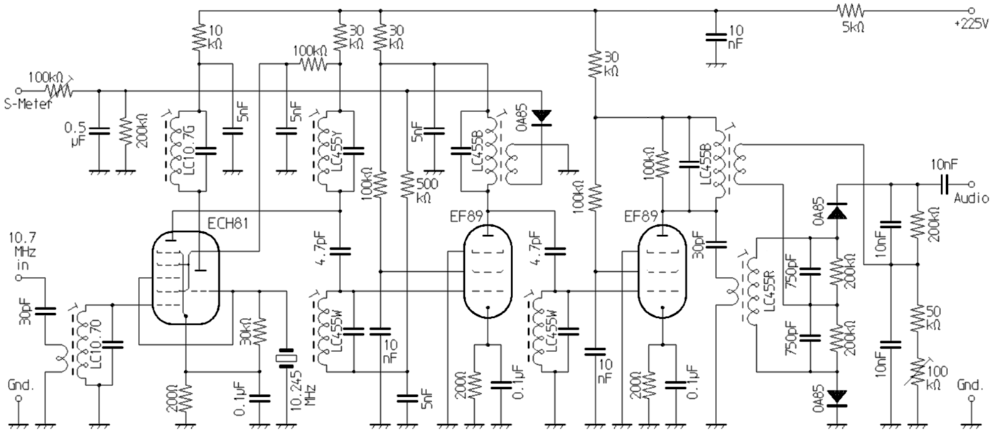Im sich an die Eingangschaltung anschließenden Doppelsuper-ZF-Teil bewerkstelligte ich die Ummischung von der ersten ZF von 10,7 MHz auf die zweite ZF von 455 kHz in der schon von meinem 10m-Superhet bekannten Weise mit der ECH81. Die darauf folgende erste ZF-Stufe meines 2m-Doppelsupers war ebenfalls gleichartig aufgebaut, wie bei meinem 10m-Empfänger. Daran fügte sich eine weitere ZF-Stufe an, welche die für FM-Demodulation benötigte hohe Leerlaufwerstärkung ermöglichen sollte. Sie steuerte meine erste Version eines mit jeweils einem japanischen ZF- und Oszillatorkreis realisierten FM-Demodulators an, der zu diesem Zeitpunkt noch als Phasendetektor ausgeführt war. Ähnliche Schaltungen übernahm ich später auch für meine selbst konstruierten Transistor-Empfänger bzw. für den Umbau von vorhandenen AM-Empfängern für FM. Die Verstärkung dieses FM-ZF-Teils war ausreichend, um bei nicht vorhandenem Signal das Eingangsrauschen NF-seitig zu einem lautstarken Leerrauschen werden zu lassen, welches je nach Signalstärke bei vorhandenem Träger mehr oder weniger verschwand. Zu einem Röhrengerät passend, schloss ich an den ZF-Verstärker-Anschluss für die Abstimmanzeige bei meinem 2m-Empfänger ein magisches Band vom Typ EM84 an.
