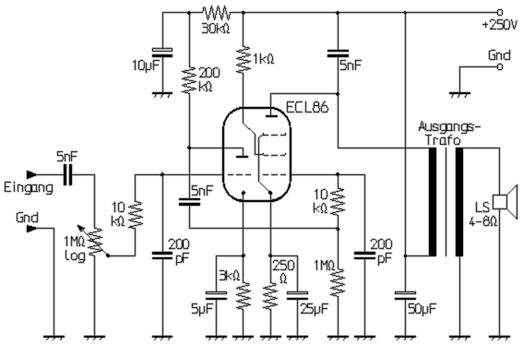 Als NF-Teil verwendete ich für meine Empfänger jeweils einen Verstärker mit einer ECL86 in Standard-Beschaltung. Passende Ausgangstrafos stammten aus Grundig-Tonbandgeräten der Serien TK14 bzw. TK17. Es handelte sich dabei um getränkte Ausführungen, so dass sie vom Rostfraß verschont blieben. Ich habe diese Anordnung für viele der von mir erprobte Röhrenempfänger-Schaltungen mit gutem Erfolg verwendet. Mit der verwendeten Röhre vom Typ ECL86 kann je nach benutztem Ausgangstrafo eine NF-Leistung von bis zu etwa 4 Watt erzielt werden. Das reicht für kräftigen Lautsprecherempfang auch in lärmerfüllter Umgebung.
