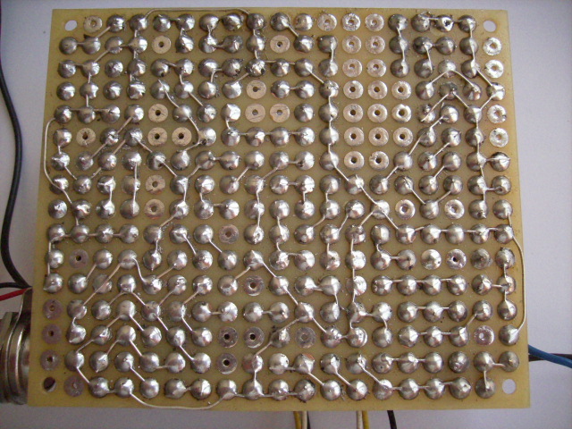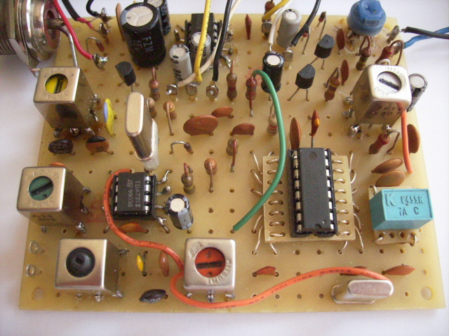 Der gezeigte Musteraufbau erfolgte auf einer Lochrasterplatte mit 5,08mm Rastermaß. Nicht passende Bauelemete, wie ICs und Filter, werden über Drähte bzw. durch Zwischenplatten mit 2,54mm Rastermaß adaptiert. Die Verdrahtung habe ich an allen Punkten verlötet, da sonst erfahrungsgemäß Störungen auftreten können, die sich als lästiges Knistern bemerkbar machen. Nicht benuzte Rasterpunkte sind zur Vermeidung von Oxidation verzinnt. Der Empfänger-Abgleich ist denkbar einfach: Der Oszillatorkreis wird so eingestellt, dass der Oszillator sicher anschwingt. Dies lässt sich mit einem auf 27,145 MHz eingestellten Empfänger kontrollieren. Der HF-Zwischenkreis (CB-Spule grün) und der ZF-Kreis (10,7-MHz-Filter orange) sind auf maximalen Zeigerausschlag des S-Meters bei vorhandenem, schwachen Eingangssignal abzugleichen. Der Demodulatorkreis (455-kHz-Filter weiß) ist auf beste NF-Lautstärke zu trimmen. In diesem Fall sollte die Demodulation zugleich die kleinsten Verzerrungen aufweisen. Der Vorkreis wird auf geringstes Rauschen bei schwachem Eingangssignal justiert. Eine Anpassung des S-Meters für Zeigerinstrumente aus alten CB-Funkgeräten, wo der untere Anzeigebereich wegen der für AM erforderlichen AGC zumeist gestreckt ist, lässt sich mit einer parallel zum Instrument in Flussrichtung geschalteten Diode 1N4148 erreichen. Wird in Serie dazu ein Trimmer (z.B. 50kΩ) geschaltet, ist zusätzlich zur Anzeigeempfindlichkeit auch ein Abgleich der Anzeigecharakteristik möglich.