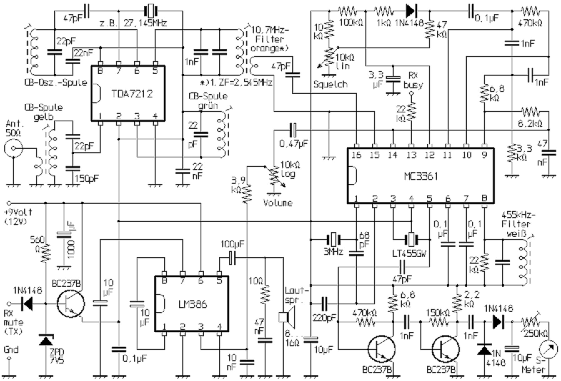 Beim nun vorgestellten FM-Empfänger können CB- oder Fernsteuerquarze, wie sie bei älteren AM-Geräten gebräuchlich waren, direkt als Kanalquarze verwendet werden. Es lassen sich damit unter anderem die 10m-FM-Relaisfrequenzen empfangen, also zum Beispiel 29,690 MHz. Hier sendet etwa der südlich von Hamburg auf dem Funkturm in Rosengarten installierte 10m-Sender der Relaisstation DF0HHH. Anstelle des beim zuvor gezeigten Empfänger verwendeten MC3357 kommt bei dieser Schaltung der etwas modernere Schaltkreis MC3361 zum Einsatz. Da es sich bei diesem Empfänger außerdem um einen Doppelsuper handelt, ist ein Frontend mit dem TDA7212 vorgeschaltet. Jener Schaltkreis wurde für Drahtlostelefone, Personenrufanlagen, Fernsteuerempfänger und dergleichen entwickelt. Im Gegensatz zum weit verbreiteten NE602 enthält dieses IC außer der Misch- und Oszillator-Schaltung auch eine HF-Vorstufe. Der Schaltkreis kann daher mit getrennter HF-Vorselektion und einem HF-Zwischenkreis betrieben werden, was neben der höheren ersten ZF die Spiegelselektion nochmals verbessert. Es wird mit der gezeigten Schaltung eine ausgezeichnete Eingangs-Empfindlichkeit und eine sehr brauchbare Großsignalfestigkeit erreicht.