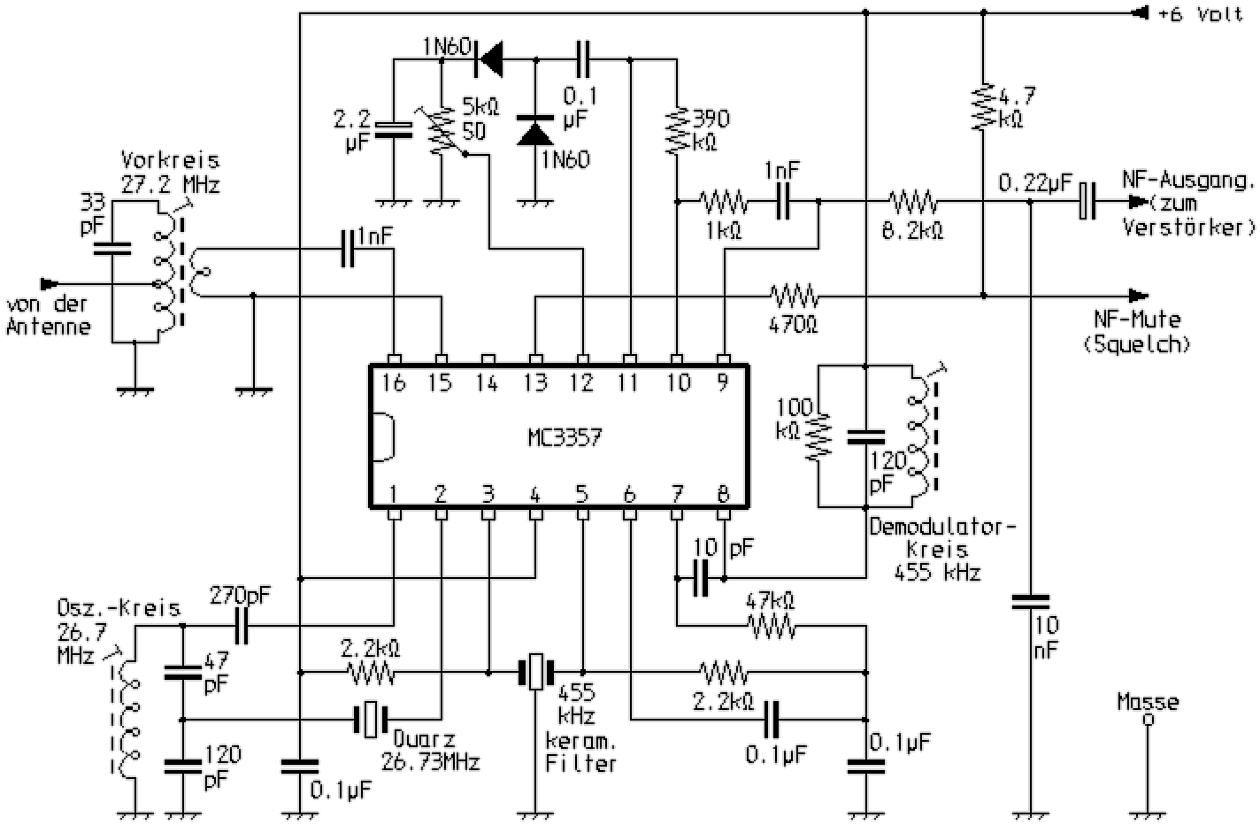 Für den CB-Funkbereich sind geeignete Quarze auch heute noch recht gut erhältlich. Sie schwingen in der Regel um die ZF niedriger wie die gewünschte Empfangsfrequenz. Zum Empfang von CB-Kanal 19 (27,185 MHz) wird also beispielsweise ein Quarz mit der Frequenz 26,730 MHz benötigt. Für den Empfang von Frequenzen im 10m-Band ist die Beschaffung hingegen nicht so einfach. Prinzipiell könnte der Oszillator auch 455 kHz über der Empfangsfrequenz arbeiten. Um etwa die Relaisfrequenz von 29,690 MHz empfangen zu können, bekommt man aber geeignete Quarze sowohl für 29,235 MHz als auch für 30,145 MHz allenfalls als kostspielige Sonder-Anfertigung. Um normale CB-Quarze verwenden zu können, benutzte ich daher die hier an anderer Stelle vorgestellte Anordnung, bei der die mit einem CB-Quarz erzeugte Frequenz mit einem frei schwingenden Oszillator im Gebiet von etwa 2 bis 3 MHz gemischt wird. Mittels Kapazitätsdioden-Abstimmung ließen sich die gewünschten Kanalfrequenzen per Spindeltrimmer justieren. Somit einfielen nun der Schwingkreis mit kapazitiven Spannungsteiler und der am MC3357 angeschlossene Quarz. Das Injektionssignal wurde dem IC über den 270-pF-Kondensator extern zugeführt. Ist der Pegel des extern zugeführten Signals zu klein, kann Pin 2 mit einem Kondensator (z.B. 10nF) gegen Masse abgeblockt werden.