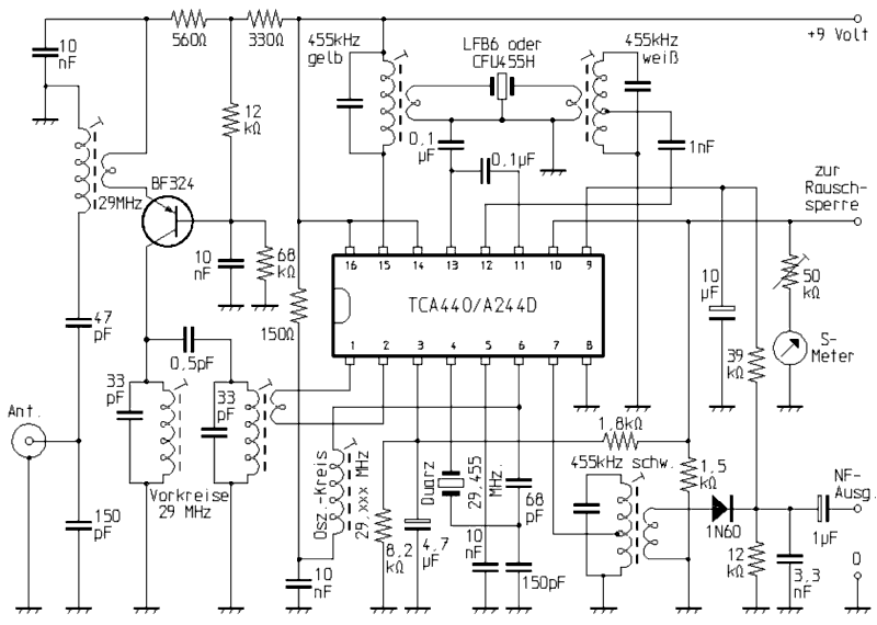 Wie im Schaltbild ersichtlich, lässt sich zur Ansteuerung einer Rauschsperre das an Pin 10 anliegende Signal verwenden, an dem auch das S-Meter angeschlossen ist. Anstelle des TCA 440 lässt sich auch der mitunter noch erhältliche A244D verwenden, welcher in der DDR bzw. in Osteuropa gefertigt wurde. Nicht von Siemens hergestellte Exemplare waren mit diesem häufig identisch und wurden für den westeuropäischen Markt lediglich als TCA440 gestempelt. Auch das russische IC K174XA2 kann anstelle des TCA440 verwendet werden.
