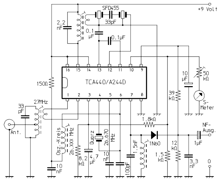 Bekanntermaßen eignet sich der integrierte Schaltkreis TCA440 nicht nur für AM-Rundfunkempfänger für Mittel- und Langwellen, sondern auch für Empfängerschaltungen für Frequenzen bis oberhalb des Kurzwellen-Gebietes. Außerdem kann der Oszillatorteil mit geringem Aufwand für quarzgesteuerten Betrieb beschaltet werden. Für den Einsatz in Empfängern für die Modellfernsteuerung wurden daher vielfach Schaltungen veröffentlicht, für die hier ein Beispiel gezeigt ist.
