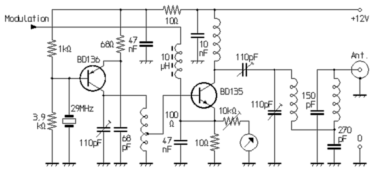 Für kleine Selbstbau-Funkgeräte eignet sich dieser quarzgesteuerte Kleinsender für das 10m-Band. Prinzipiell ist auch der Einsatz in CB-Funkgeräten oder als Telemetrie- bzw. Fernsteuersender denkbar, was jedoch nicht ohne weiteres zulässig ist. Im Amateurfunk wäre auch der Einsatz als Telegrafie- bzw. Bakensender möglich. Es eignen sich Obertonquarze, deren dritter Oberton auf der gewünschten Sendefrequenz liegt. Der Oszillator arbeitet mit einem PNP-Transistor. Dies minimiert den Aufwand für die Anpassung an die sich direkt anschließende PA-Stufe, die mit einem NPN-Transistor aufgebaut ist. Im Senderausgang befindet sich ein zweigliedriges Pi-Tiefpassfilter, wodurch die Abstrahlung von Oberwellen deutlich reduziert wird.