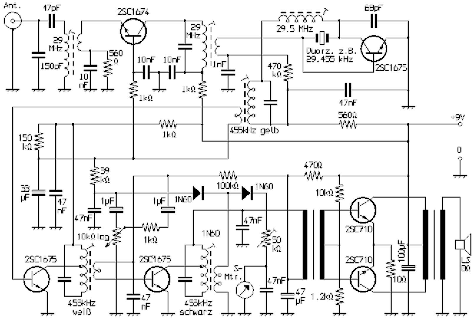 Dieser Empfänger ist ein kompletter Superhet mit HF-Vorstufe, Mischer mit quarzgesteuertem Oszillator, einem AM-Demodulator, einem zweistufigen ZF-Verstärker mit Regelung und einem ebenfalls zweistufigen NF-Verstärker mit Gegentakt-Endstufe. Durch die mehrfache Ausnutzung von Stufen arbeitet die Schaltung mit insgesamt nur sechs Transistoren. Die HF-Vorstufe arbeitet mit einem 2SC1674 in Basis-Schaltung. Sie weist keinerlei Besonderheiten auf und wird gemeinsam mit der ersten ZF-Stufe über die Gleichspannungs-Komponente am AM-Diodenmodulator geregelt. Der quarzgesteuerte Oszillator arbeitet zugleich als Mischer. Es handelt sich somit also um eine selbstschwingende Mischstufe, die infolge der Quarzsteuerung eine sehr gute Frequenzstabilität aufweist. Die zweite ZF-Stufe dient als Reflexstufe gleichzeitig der NF-Vorverstärkung. Sie steuert über den Treibertrafo direkt die sich daran anschließende Gegentakt-Endstufe an.
