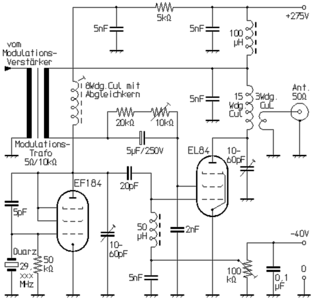 Meine ersten Erfahrungen mit selbstgebauten Sprechfunk-Sendern sammelte ich im oberen KW-Bereich. Ich baute zunächst Schaltungen mit Transistoren nach, die für Fernsteuerzwecke in der Fachliteratur und in Elektronik-Zeitschriften seinerzeit in großer Anzahl veröffentlicht wurden. Nach vielen Misserfolgen, wohl auch aufgrund der mir damals noch fehlenden Erfahrungen, versuchte ich es mit Röhren, frei nach den Ausführungen von Karl Schultheiß in Der Kurzwellen-Amateur und Werner W. Diefenbach in seinem Amateurfunk-Handbuch. Der Durchbruch gelang mir dann mit der hier gezeigten Schaltung.