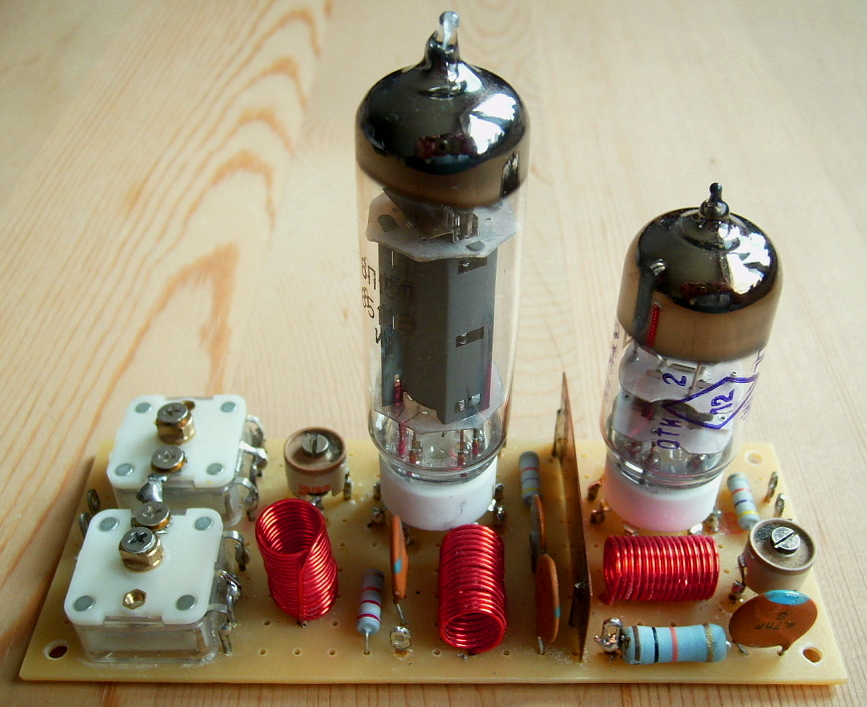 Das Foto zeigt einen ähnlichen Sender, den ich vor nicht allzu langer Zeit für weitere Versuche mit diesem Schaltungskonzept aufgebaut habe. Er ist mit den russischen Röhren 6С3П (6S3P) im Oszillator und 6П15П (6P15P) in der Endstufe aufgebaut und hat vergleichbare Eigenschaften. Allerdings ist die Ausgangsleistung hier etwas kleiner. Zusätzlich ist im Senderausgang ein Pi-Filter vorhanden, das mit zwei AM-Radio-Drekos abgestimmt wird. Es zeigte sich, dass der Pierce-Oszillator, bei dem es sich ja um einen Parallelresonanz-Oszillator handelt, mit den meisten Obertonquarzen auf einer etwas zu hohen Frequenz schwingt. Die Abweichung liegt bei den meisten solcher Quarze etwa im im Bereich von 2 bis 6 kHz. Abhilfe schafft eine Abgleichspule in Serie zum Quarz oder besser noch ein Trimmer-Kondensator parallel zum Quarz. Versuche helfen hier schnell weiter.