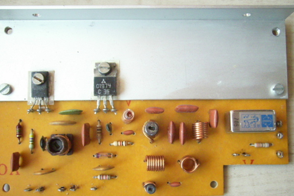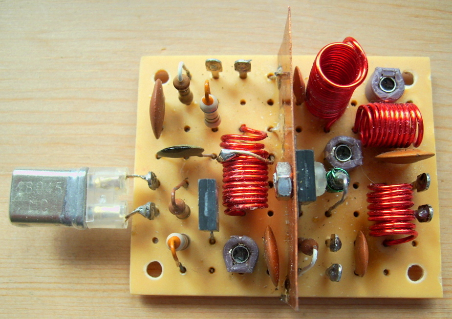 Das Foto zeigt die Treiber- und Endstufe eines solchen Senders. Es handelt sich um eine in Ätztechnik selbst hergestellte Baugruppe aus einem Selbstbau-Funkgerät. Das ganz rechts erkennbare Relais ist für die Antennenumschaltung vom Empfänger auf den Sender. Die Endstufe mit hochfrequenzmäßig geerdetem Kollektor arbeitet ausgesprochen stabil. Sie könnte prinzipiell auch dem Eingangs gezeigten zweistufigen Sender nachgeschaltet werden.