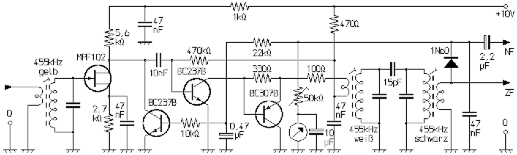 Am mit "ZF" bezeichneten Ausgang kann z.B. ein FM- oder SSB-Demodulator angeschlossen werden. Die eigentlich der Regelspannungserzeugung dienende Diode kann auch zur AM-Demodulation verwendet werden. Das durch sie demodulierte Signal liegt am mit "NF" bezeichneten Anschluss an. Außerdem kann an ihrer Kathode die Spannung für ein S-Meter abgenommen werden. Die Regelung erfolgt über den linken Transistor BC237B. Mit zunehmender Signalspannung steigt seine Leitfähigkeit zwischen Emitter und Kollektor. Der damit einhergehende Stromfluß bewirkt einen steigenden Spannungsabfall am Drainwiderstand und damit einerseits eine Reduzierung der Drainspannung des FET, womit dessen Verstärkung sinkt. Zum anderen wird vom Kollektor das Ausgangssignal der FET-Stufe mehr und mehr gegen Masse kurzgeschlossen, so dass die Regelung in zweifacher Weise wirkt. Auf diese Art lässt sich ein Regelumfang erzielen, wie er durch einfache Arbeitspunktverschiebungen sonst nur über mehrere Stufen erreichbar wäre. Bei dieser Schaltung hingegen reicht die Regelung der einen ZF-Stufe für einen kompletten Superhet-Empfänger bereits völlig aus. Die zweite ZF-Stufe, die mit dem rechten BC237B und einem BC307B gebildet wird, sorgt für eine hohe Spannungsverstärkung und eine hinreichend niederohmige Auskopplung, um das Signal dem ersten ausgangsseitigen ZF-Kreis über seine Koppelwicklung zuzuführen. Trotz des vergleichsweise geringen Aufwands zeigt die Schaltung insgesamt hervorragende Eigenschaften. Selektivität und Regelung sind deutlich besser, wie bei der typischen zweistufigen Anordnung, wie man sie in vielen Transistorradios und CB-Funkgeräten fand. Bei jener waren zwei Transistorstufen in Emitterschaltung gebräuchlich, die am Eingang, untereinander und zwischen Ausgang und Demodulator über jeweils einen der auch hier eingesetzten ZF-Einzelkreise (gelb, weiß, schwarz) gekoppelt waren.