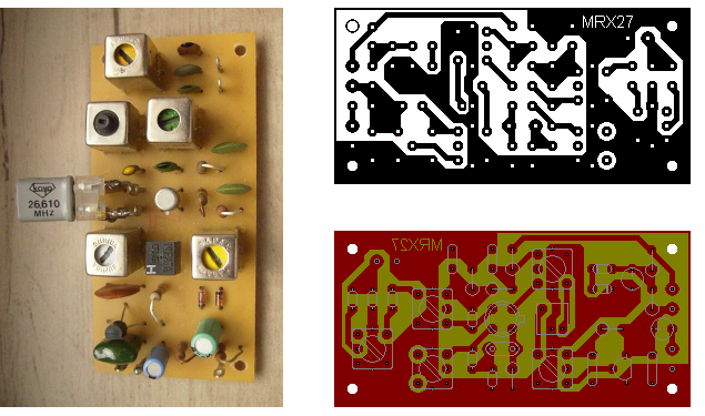 Ich habe den Empfänger ursprünglich für Fernsteuerzwecke (27 MHz) konzipiert, dabei aber auch an einen möglichen Einsatz in tragbaren 10m-Funkgeräten gedacht. Demzufolge würde er sich auch gut als Ersatz für die Pendel- bzw. Superregenerativ-Empfänger in den an anderer Stelle beschriebenen Handfunkgeräten eignen. Die Schaltung ließe sich bei entsprechender Dimensionierung der Schwingkreise (z.B 10,7MHz-ZF-Filter mit Parallel-Kondensator) auch für den Rundfunkempfang im KW-Bereich verwenden. Mit einem 5615-kHz-Quarz käme man zum Beispiel zu einem einfachen und zuverlässigen Empfänger für DARC-Radio im 49m-Band (6070kHz AM). Da in diesem Falle kein Schwingen des Quarzes auf dem 3. Oberton erzwungen werden muss, ließe sich die Oszillator-Beschaltung des MOSFETs aperiodisch gestalten. Die Spule an Gate 1 kann dann durch eine Parallelschaltung eines Widerstands mit einem Grundwellenquarz ersetzt werden. Diese Beschaltung findet man beim 20m-40m-Konverter, den ich in einem anderen Beitrag beschreibe.