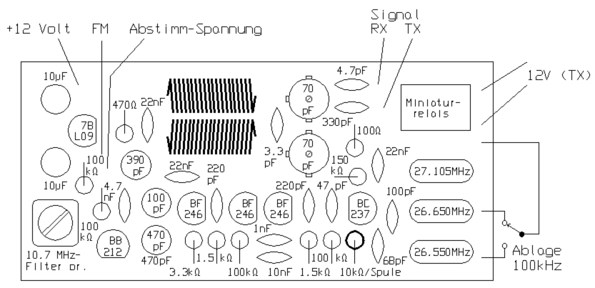 Diese hier gezeigte Schaltung wurde ursprünglich entworfen, um alte AM-CB-Geräte mit Einzelquarzen für den Relaisbetrieb im 10m-Band umbauen zu können, später enstanden auf dieser Basis auch komplette 10m-FM-Selbstbau-Funkgeräte. Bei der Frequenzaufbereitung handelt es sich um einen sogenannten Super-VFO. Hier wird das Signal eines frequenzvariablen Oszillators (z.B. 2,85…3,05 MHz) mit dem eines frequenzstabilen Quarzoszillators gemischt, wobei infolge der niedrigen Abstimmfrequenz die Quarzstabilität annähernd auf das ausgesiebte Mischprodukt übertragen wird. Auf diese Weise können Frequenzen zwischen 29,5…29,7 MHz abgestimmt werden.