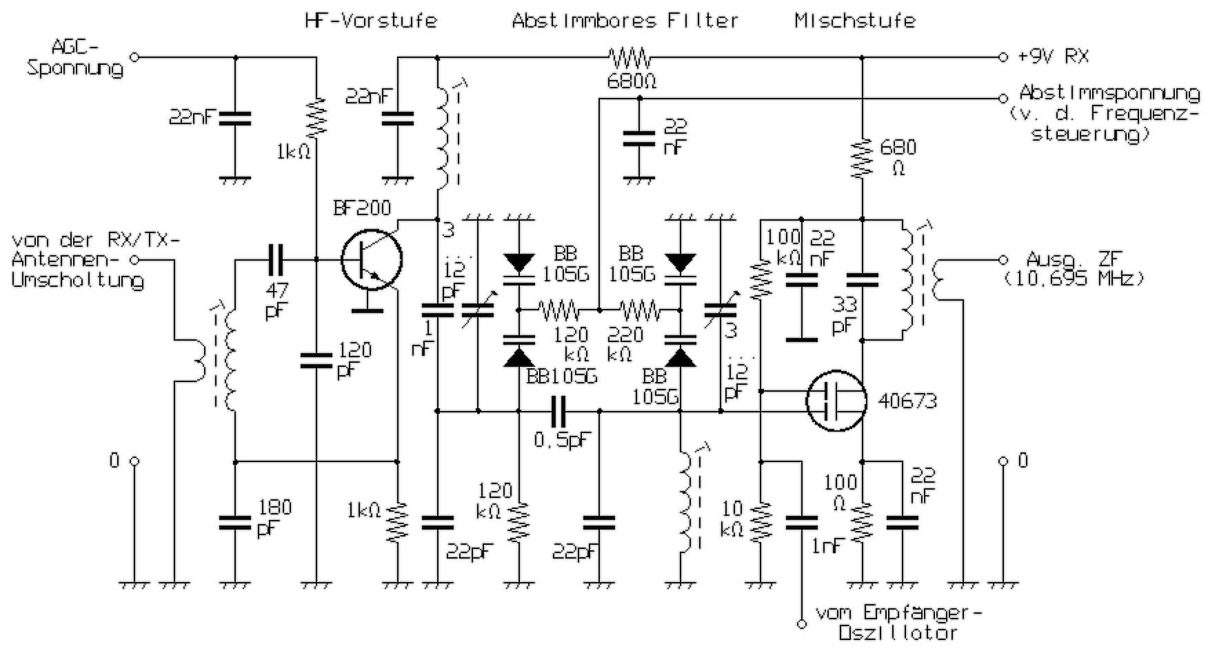 Wie im Schalbild ersichtlich, waren die Zwischenkreise als mitlaufende Selektion konzipiert. Die dafür benötigte Steuerspannung wurde durch ein mechanisch mit dem Drehkondensator vom Abstimm-VFO gekoppeltes Potentiometer erzeugt. Durch die Zusammenschaltung jeweils zweier Kapazitätsdioden wurde die Gefahr zusätzlicher Intermodulationen durch die Abstimm-Schaltung reduziert. Die HF-Vorstufe arbeitete in sogenannter Zwischenbasis-Schaltung. Bei einer solchen Anordnung fallen Leistungs- und Rauschanpassung zusammen. Mit dem Abgleich des Eingangskreises auf Signalmaximum wurde also zugleich bestes Signal/Rauschverhältnis erzielt. Die Mischstufe mit dem Dual-Gate-MOSFET produzierte kaum zusätzliches Rauschen. Solche Schaltungen weisen außerdem ein erheblich besseres Großsignal-Verhalten auf, wie Mischerschaltungen mit einem bipolaren Transistor.