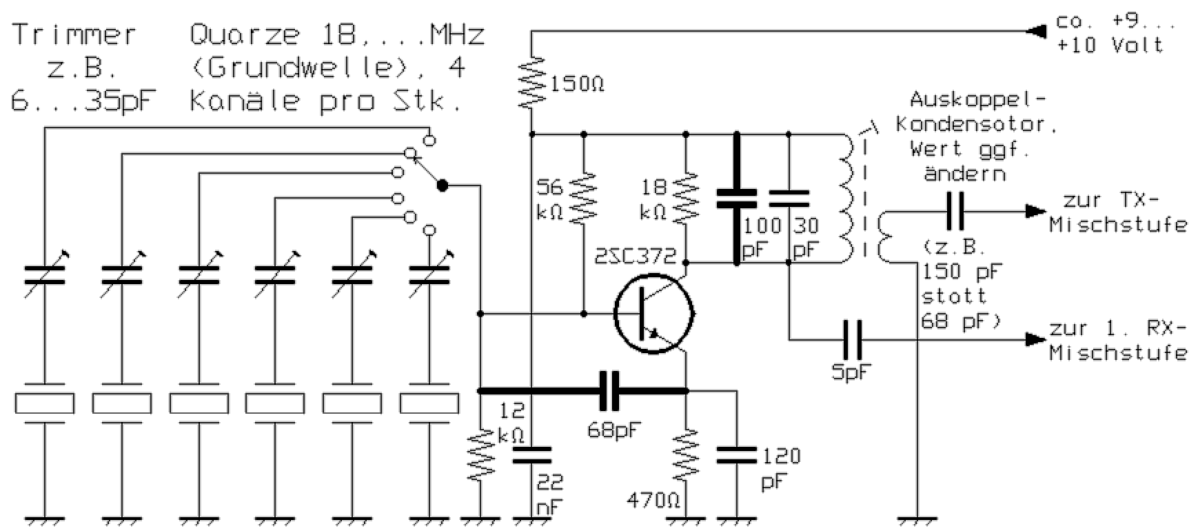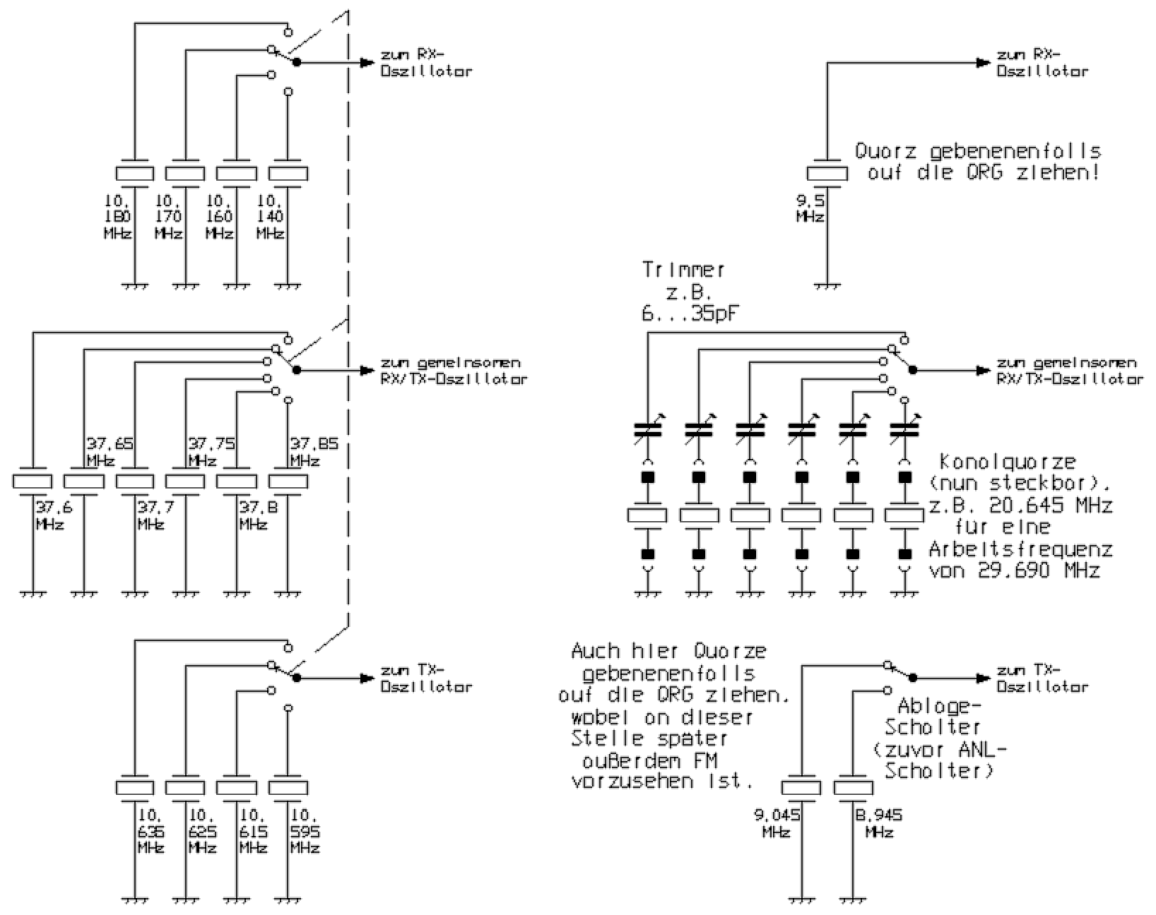 Der Umbau durch Wechseln der Quarze wird gewöhnlich daran scheitern, dass solche mit passenden Frequenzen nicht greifbar sind und eine Auftragsanfertigung den Kostenrahmen eines solchen Bastelprojektes sprengt. Eine einfache Möglichkeit bestand früher darin, den ersten Oszillator unterhalb der Eingangsfrequenz schwingen zu lassen. Hiermit ließen sich wesentlich leichter zu beschaffende 18-MHz-Quarze verwenden. Man gelangte dann in den Frequenzbereich von 28,6 MHz, wo seinerzeit auch AM-Betrieb gemacht wurde. Um solche Quarze benutzen zu können, musste der im Originalzustand im 37-MHz-Gebiet schwingende Oszillator wie nachfolgend gezeigt umgebaut werden: