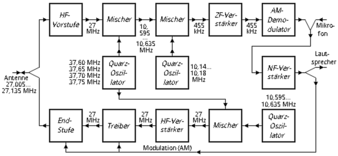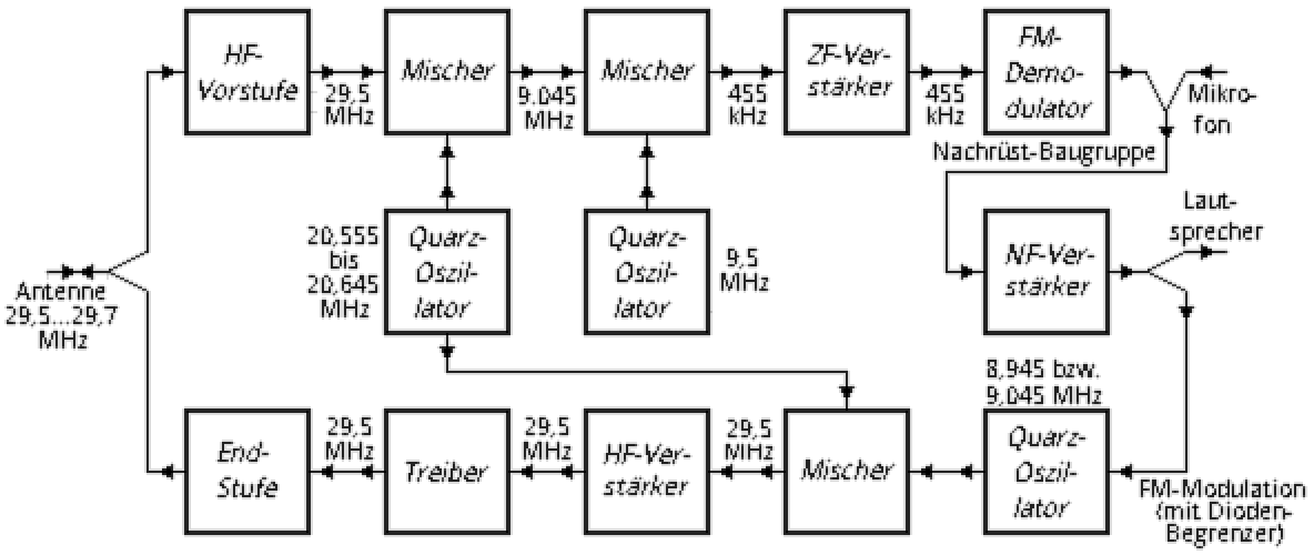 Zum Umbau eines solchen Gerätes sind vor allem zwei Dinge nötig: Zunächst wird der Frequenzbereich geändert, dann wird das Gerät Empfänger- und Senderseitig von AM-Modulation auf FM-Modulation umgerüstet. Hier wird der Umbau des abgebildeten M-511 Mobilgerätes, das in den 1970er-Jahren von DNT hergestellt wurde, beschrieben. Im Originalzustand wurde die 27-MHz-Sendefrequenz erzeugt, indem die Frequenz eines Quarzoszillators im 37-MHz-Gebiet mit einer solchen von ca 10,6 MHz gemischt wurde. Beim Empfänger, ein Doppelsuperhet, mischte der auch beim Senden benutzte Oszillator, der je nach eingestelltem Kanal auf 37,6, 37,65, 37,7 oder 37,75 MHz schwang, das Eingangssignal auf eine nicht fest liegende ZF von ca. 10,6 MHz. Diese wurde in Abhängigkeit vom jeweiligen Kanal mit den Quarzfreqeunzen 10,140, 10,160, 10,70 oder 10,180 MHz auf eine letzte ZF von 455 kHz gebracht. Das Blockschaltbild eines solchen Gerätes ist hier gezeigt: