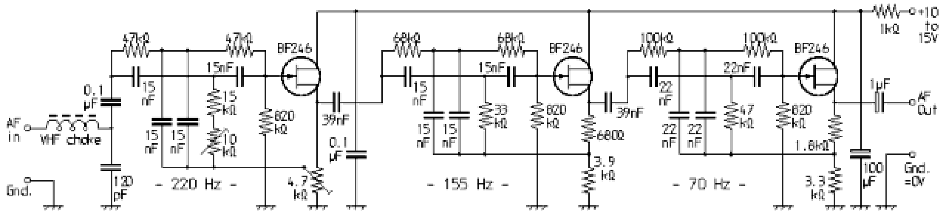 Schwieriger wird es hingegen, wenn die CTCSS-Töne generell unterdrückt werden sollen. Man wird zunächst annehmen, dass ein Hochpass dann die geignete Variante ist. Mit einem Hochpass, der um eine aktive Stufe mit z.B. einem Transistor oder einem Operationsverstärker aufgebaut ist, erzielt man im allgemeinen eine Steilheit von etwa 12dB/Oktave bzw. 40dB/Dekade. Das reicht keinesfalls aus: eine Unterdrückung des Subtones von 250,3 Hz mit ca. 12 dB würde demzufolge ja die zu übertragenden Sprachsignale bis über 500 Hz schwächen und somit den Klang deutlich verschlechtern. Gerade für den zuletzt genannten Fall der Weiterverarbeitung zur Wiederaussendung ist aber eine Unterdrückung von 12 dB noch viel zu wenig. Rechnerisch ergibt sich hieraus zunächst, dass eine Filtergruppe mit vier Stufen (48 dB/Oktave) gerade ausreichen könnte, das Sprachsignal bei ausreichender Unterdrückung der Subtöne kaum zu verfälschen. Da aber die Unterdrückung dieser Gruppe nicht sofort bei 300 Hz mit der angegebenen Steilheit einsetzt, ist auch das nicht der Fall. Wie auch praktische Versuche bestätigten, lässt sich kaum eine Dimensionierung finden, bei der ein guter Kompromiss aus guter Unterdrückung des CTCSS-Tones und minimaler Verfälschung des Sprachsignals gegeben ist. Der Abstand von 250 Hz zu 300 Hz ist einfach zu gering! Basierend auf diesen Vorüberlegungen und entsprechenden Versuchen entstand die nachfolgend gezeigte Schaltung.
