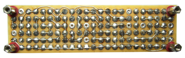 Ich habe die Schaltung in der bei mir für Transistorschaltungen beliebten Aufbautechnik auf einer 5,08mm-Lötpunkt-Lochrasterplatte realisiert. Dieser Aufbau ist auf den Fotos oben und unten zu sehen. Die Baugruppe ist beim Amateurfunkrelais DB0XH im Westen Hamburgs erfolgreich im Einsatz.