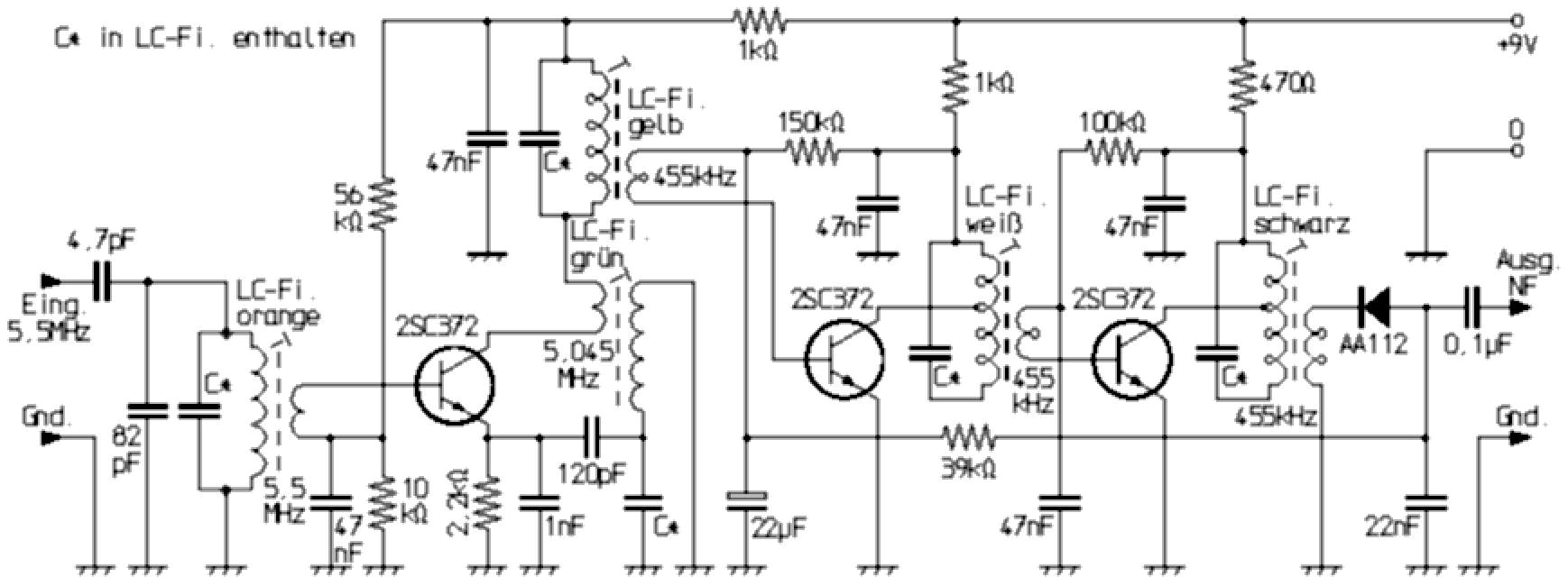 Eine ähnliche selbstschwingende Mischstufe, wie sie früher in den AM-Bereichen der meisten transistorisierten Rundfunkempfänger zu finden war, setzt hier das 5,5-MHz-Eingangssignal auf die zweite Zwischenfrequenz von 455 kHz um. Dort wird das Signal in zwei Stufen verstärkt und anschließend demoduliert. Mit einem passenden Tuner und einem nachgeschalteten NF-Verstärker erhält man einem AM-Empfänger, der etwa zum Empfang des Flugfunks ausgelegt sein kann. Hierzu würde sich z.B. der Eingangsteil von meinem Doppelsuper für 144-146 MHz eignen, wenn die Vorkreise im Bereich von 118 bis 136 MHz mittels eines Dreifach-Drehkos synchron mit dem Oszillator (123,5…141,5 MHz) abgestimmt werden und die ZF durch einen Parallel-Kondensator (ca. 100pF) zum 10,7-MHz-Kreis auf 5,5 MHz umdimensioniert wird.