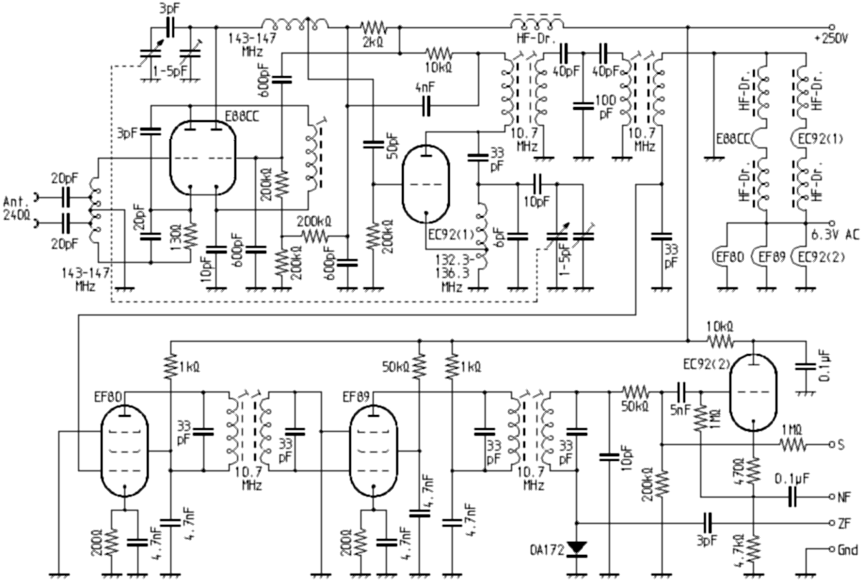 Später wurde das Sortiment dieser Einbausuper um Modelle für weitere Frequenzbereiche erweitert. Darunter war auch eine Ausführung für den Frequenzbereich von 32,5 bis 38,5 MHz zum Empfang von drahtlosen Mikrofonen für Veranstaltungen. Die größte Bedeutung dürfte aber im weiteren eine Version für den seinerzeit an Bedeutung gewinnenden 2m-Amateurfunk gehabt haben. Diese war für den Empfangsbereich von 143 bis 147 MHz ausgelegt. Da hier damals die Betriebsart AM dominierte, war der Empfänger dementsprechend dafür ausgelegt. Die Schaltung des Rundfunksupers wurde größtenteils unverändert übernommen. Abgesehen von den anders dimensionierten HF-Kreisen war im Wesentlichen nur der Demodulator und der NF-Ausgang anders aufgebaut. Wie der Schaltplan zeigt, folgt auf den mit einer Germanium-Diode arbeitenen AM-Demodulator ein als Kathodenfolger geschalteter Impedanz-Wandler mit einer zweiten Röhre vom Typ EC92, welche an der Stelle montiert war, wo bei der Rundfunk-Version die EAA91 für den Ratio-Detektor platziert war. So konnte der Aufbau auf dem gleichen Chassis erfolgen. Der Impedanzwandler bot die Möglichkeit, einen transistorisierten NF-Verstärker direkt anschließen zu können. Für mobile Funkanlagen konnte dieser dann auch zum Modulieren des Senders herangezogen werden.