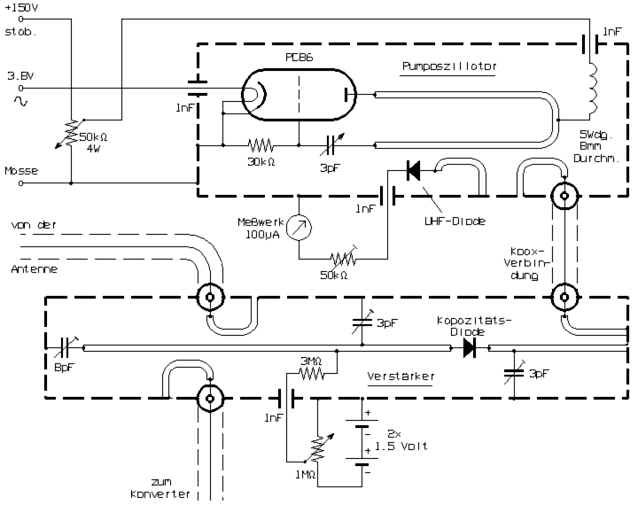 Die Situation änderte sich aber mit dem Erscheinen von Kristalldioden auf Halbleiterbasis, welche bald für immer höhere Frequenzen brauchbar waren. Selbst für höchste Frequenzen geeignete Exemplare besitzen eine unvermeidliche, bei anderen Anwendungen eher unerwünschte Sperrschichtkapazität. Infolge des bei Halbleiterdioden vorhandenen Zusammenhangs zwischen der Sperrspannung und der Sperrschichtkapazität gab es damit nun erstmals eine effektive Art und Weise, die Reaktanzmodulation mit ausreichender Schnelligkeit durchzuführen und das theoretische Prinzip praktisch erproben zu können. Für die parametrische Verstärkung wird im Verhältnis zur Signalfrequenz nämlich eine doppelt oder besser sogar dreimal so große Modulationsfrequenz benötigt. Diese wird vom sogenannten Pump-Oszillator geliefert. In der vorgestellten Schaltung dient dazu ein für das 23cm-Gebiet ausgelegter Oszillator, der mit einer eigentlich für TV-Tuner entwickelten UHF-Röhre arbeitet. Zur Schwingungserzeugung dient ein Rohrkreis. Eine Anordnung mit einem Topfkreis wäre hier auch geeignet.