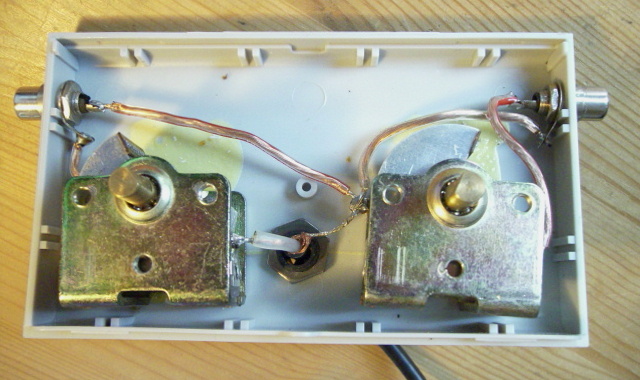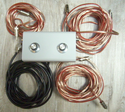 Obiges Foto zeigt den simplen Innenaufbau eines für QRP ausgelegten Nyfaz-Antennenkopplers. Ohne festes Tragekreuz ist solch eine Antenne beispielsweise gut zur Mitnahme in ein Hotelzimmer geeignet. Die verwendete Lautsprecher-Leitung kann zum Beispiel mit Schuhbändern oder Wäscheklammern an Einrichtungsgegenständen fixiert werden oder je nach Beschaffenheit des Unterbaus auch einfach horizontal auf dem Boden ausgebreitet werden. Experimente mit verschiedenen Lautsprecherkabel-Typen und mit unterschiedlichen Leitungs-Querschnitten zeigten, dass dann mit den Leitungslängen gegebenenfalls etwas experimentiert werden muss. Unten ist eine solche Nyfaz-Wurfantenne zu sehen, die in jedem Reisegepäck Platz finden sollte. Sie besteht aus dem Koppler und jeweils einem Strahler für das 40m- und das 20m-Band sowie einem Verlängerungsstück, mit dem der 40m-Strahler sich im 80m-Band in Resonanz bringen lässt.