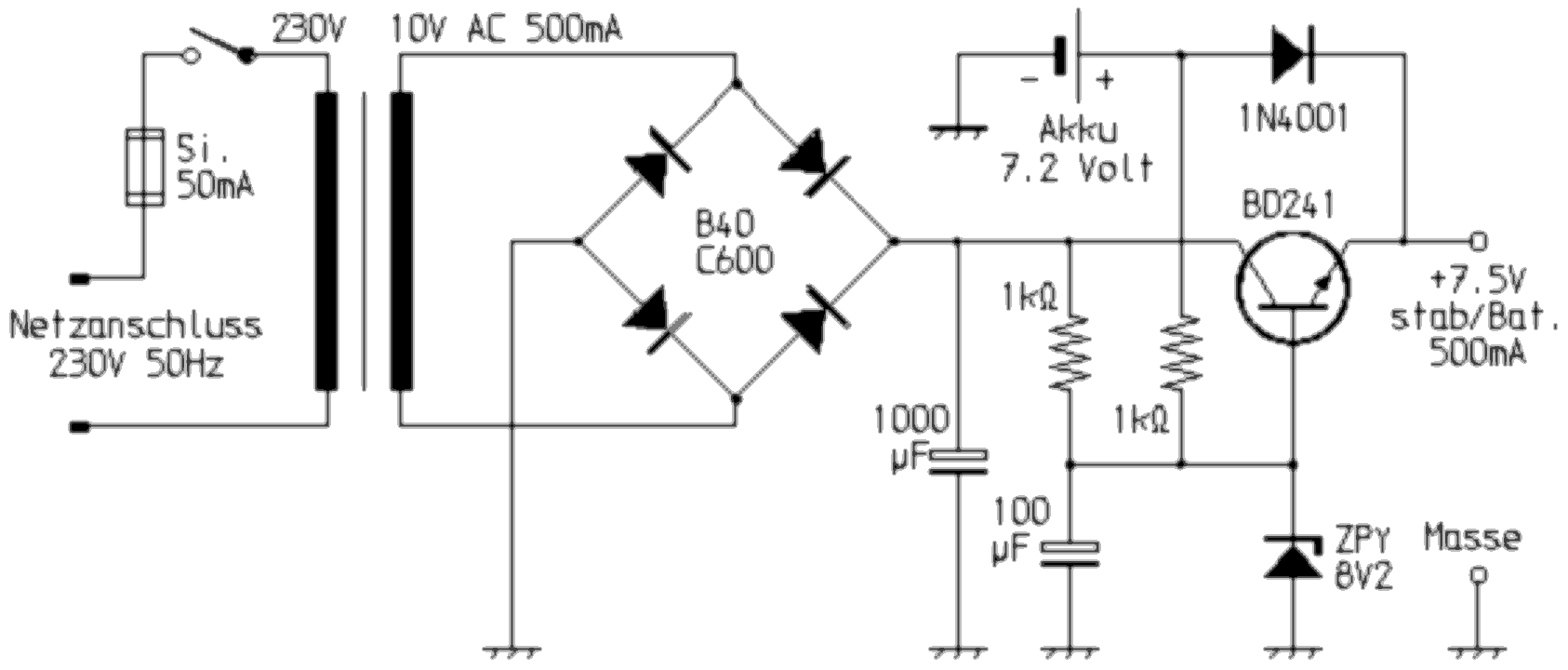 Bei dieser einfachen Notstrom-Versorgung wird bei fehlender Netzspannung auf Akkubetrieb umgeschaltet. Bei vorhandener Netzspannung wird der Akku mit einem Strom von weniger als 1mA nachgeladen (Erhaltungsladung). |