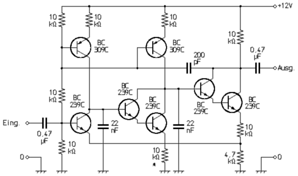 Dies ist ein Selektivverstärker, der durch Verwendung des Gyratorprinzips ohne eine Spule auskommt. In der angegebenen Dimensionierung beträgt die Mittenfrequenz ca. 730 Hz (16000/C in nF). Die Güte beträgt etwa 300…500, die Spannungsverstärkung 300.