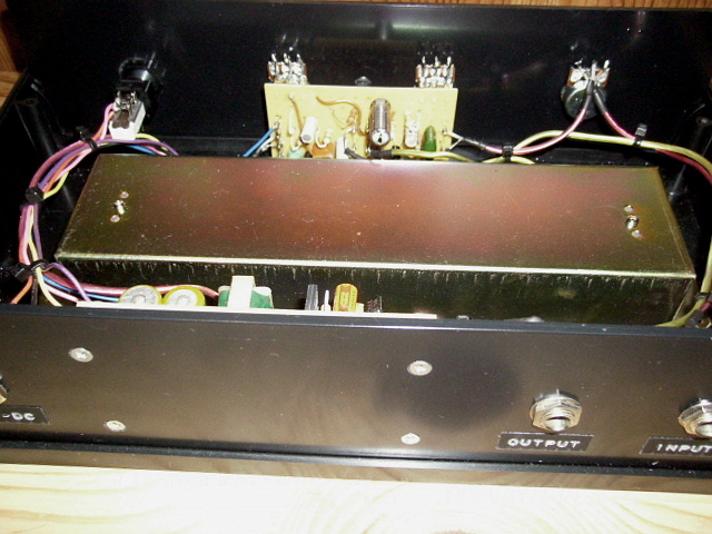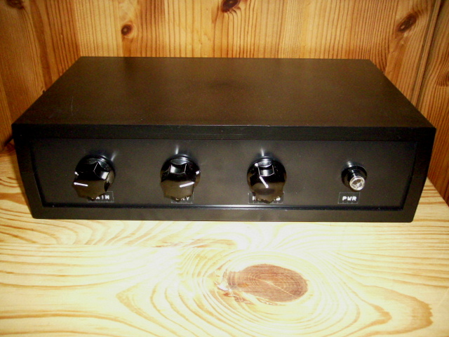 Folgende Fotos geben einen Eindruck vom konstruktiven Aufbau des Mustergerätes. Auf der Frontplatte befinden sich die Einsteller für Eingangs-Empfindlichkeit, Bypass-Pegel und Hallpegel sowie der Ein/Aus-Schalter.