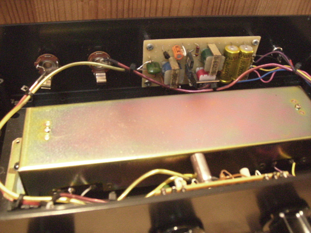 Von Vorne ins offene Gerät geblickt, ist der an die Geräterückwand geschraubte Treiberverstärker für das Hallsystem sichtbar. Auf der Platine befindet sich auch die Siebkette für die Stromversorgung. Ganz rechts ist auf der Innenseite der Rückwand auch die DC-Buchse für den Hohlstecker vom Netzgerät zu sehen.