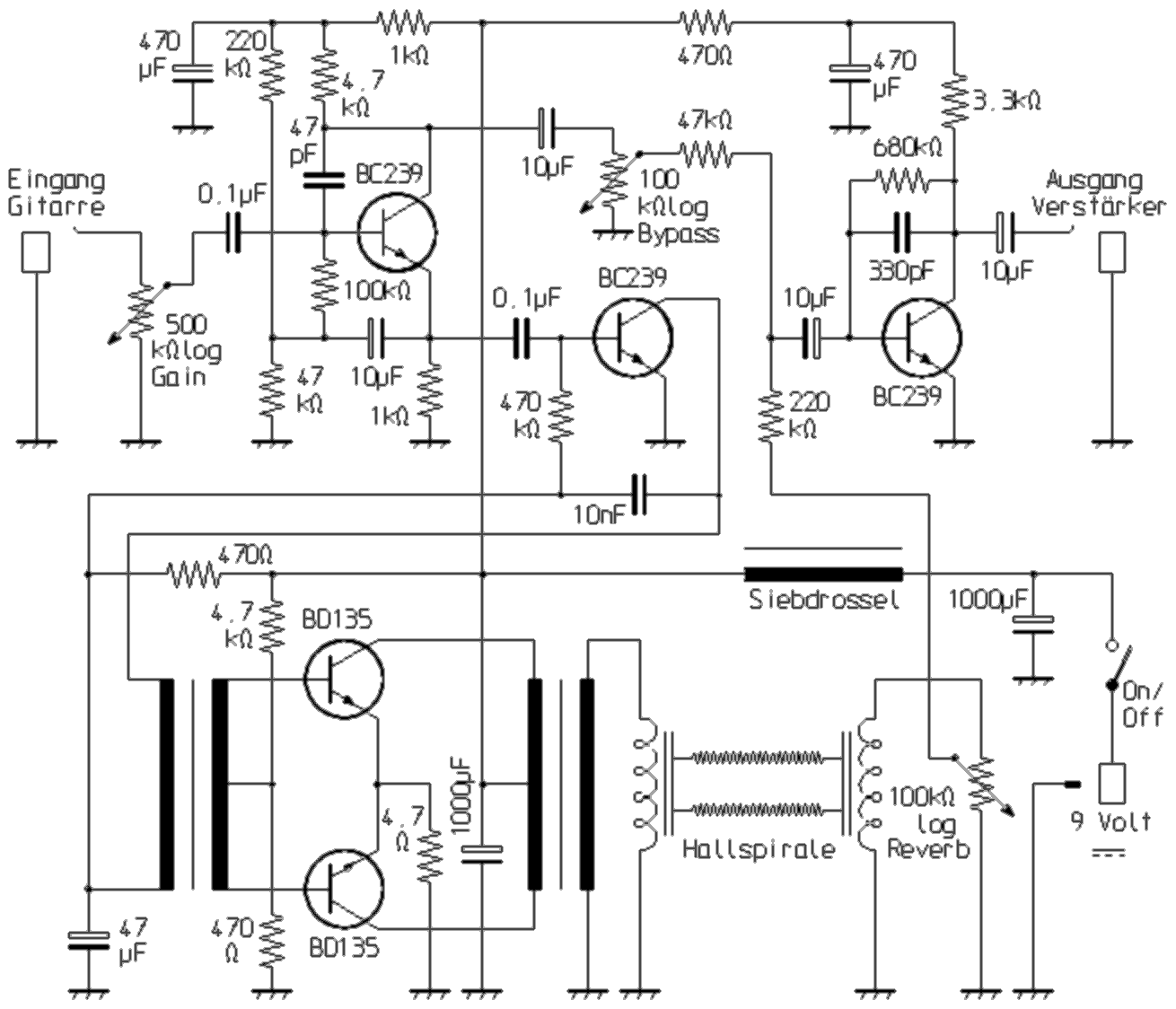 Hier nun der Schaltplan eines elektromechanischen Hallgerätes mit Federspirale. Die Eingangsstufe arbeitet mit positiver Rückkopplung (Bootstrap), wodurch der Gitarren-Tonabnehmer impedanzmäßig nur wenig belastet wird und der Klang der E-Gitarre folglich kaum verfälscht wird. Der Geberverstärker arbeitet als Gegentakt-Verstärker mit Übertragern. Dadurch und durch den recht klein bemessenen Kondensator am Eingang der Treiberstufe (0,1µF) ist sichergestellt, dass das Erregersystem der Hallspirale nur Frequenzen angeboten bekommt, die von ihr sauber und ohne Überschwingen des Hallsystems verarbeitet werden können. Das Signal vom Nehmersystem der Hallspirale wird mit dem am Kollektor der Eingangstufe abgenommenen unverhallten Originalsignal zusammen gemischt und über eine weitere Verstärkerstufe zum Ausgang des Gerätes geführt.