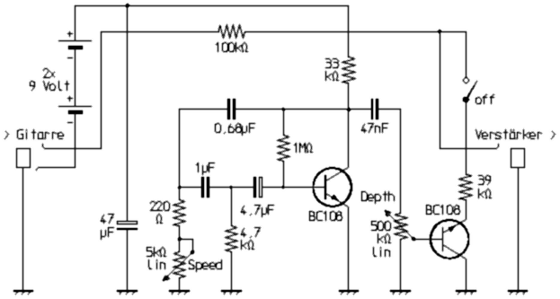 Sehr beliebt ist unter den Vintage-Effekten auch das Vibrato. Hier wird ein periodisches Auf- und Abschwellen der Lautstärke erzielt. Aus Anpassungsgründen geht damit, gerade bei einfachen Schaltungen wie dieser, eine auch stark vom verwendetem Gitarren- und Verstärkermodell beeinflusste, regelmäßig wiederkehrende Veränderung des Klanges einher. Infolgedessen kommt es auch zu einem leichten Phasing-Effekt. Dies dürfte der Hauptgrund sein, weshalb viele Musiker diese einfachen Effekte als besser bewerten, wie viele aufwändige Geräte. |