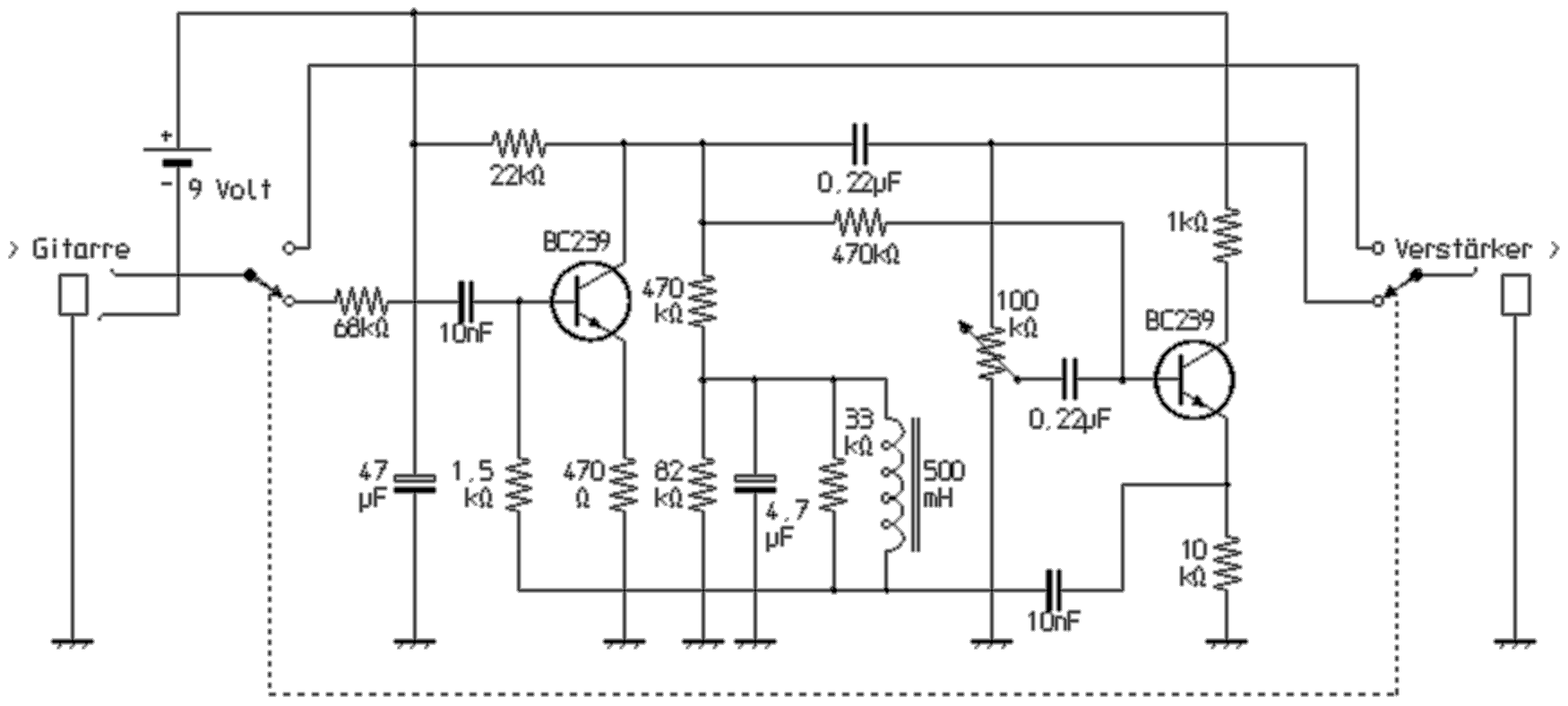 Eine Besonderheit bei diesem Hallgerät ist, dass das Originalsignal und das Signal von der Hallfeder unabhängig voneinander eingestellt werden können. So lassen sich Extrem-Effekte erzielen, wie sie unter anderem beim Psychedelic Rock mitunter gern eingesetzt wurden. Außerdem kann man das Originalsignal vollig unterdrücken und das Gerät ohne eine besondere Umschalt-Vorrichtung als Einschleifgerät an einem Mischpult einsetzen. Das Gerät wird aus einem Steckernetzgerät betrieben. Da jenes eine ungesiebte Gleichspannung liefert, befindet sich in der Stromzuführung eine Siebkette mit zwei Elkos und einer Drossel. Um den Netzbrumm klein zu halten werden außerdem in den beiden Vorstufen recht große Siebelkos verwendet (jeweils 470µF). |