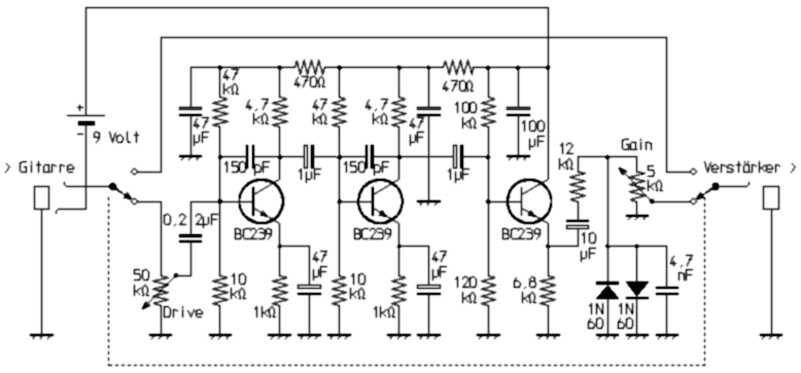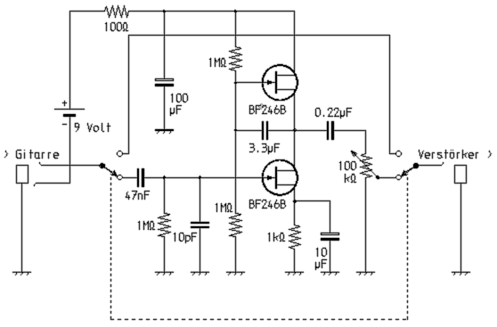 Dieser Mini-Booster mit Feldeffekt-Transistoren lässt die Gitarre recht authentisch wie mit einem übersteuerten Röhrenverstärker klingen. Bei kleinerer Speisespannung (z.B. 9 Volt) ergibt sich eine nur ganz leichte Verzerrung. Diese lässt sich durch eine größere Betriebs-Spannung steigern, indem man z.B. zwei 9-Volt-Batterien hintereinanderschaltet. Wenn noch größere Verzerrung erwünscht ist, lassen sich zwei dieser Schaltungen hintereinanderschalten, ohne etwas vom Röhrencharakter des Sounds eingebüßt wird. |