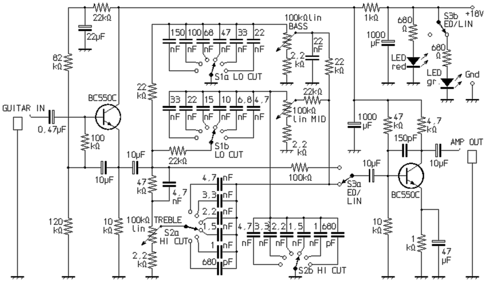 Dieser Dreiband-Klangregler ist für elektrische Musikinstrumente, insbesondere für E-Gitarren gedacht. Da sich kein exakt linearer Frequenzgang einstellen lässt, ist die Schaltung nicht für Hifi-Anwendungen geeignet. Dafür lässt sich der Klang anpassen, wenn eine Gitarre an eine nicht speziell für Gitarren gedachte Anlage angeschlossen wird. Durch umschaltbare Übergangsfrequenzen bestehen vielfältige Anpassungsmöglichkeiten des Klangbildes. Durch die Eingangsschaltung mit Bootstrap-Rückkopplung wird eine hohe, mit Röhrenschaltungen vergleichbare Eingangsimpedanz erzielt (über 1MΩ).