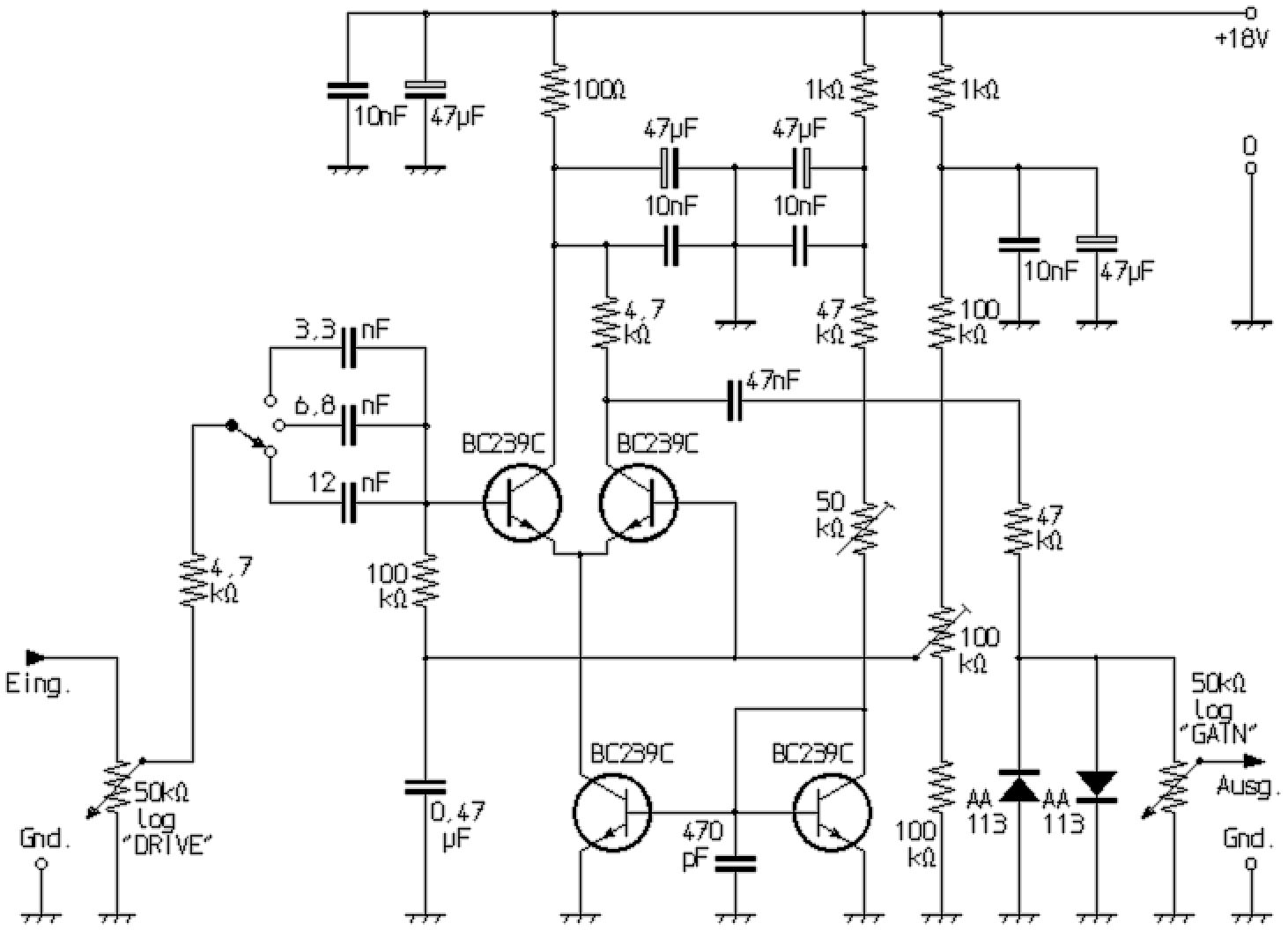 Diese Schaltung eignet sich dazu, leichter übersteuerte Gitarren-Sounds zu erzeugen. Sie beinhaltet zugleich eine Art Treble-Booster. Infolgedessen läßt sich trotz Übersteuerung auch bei Akkorden ein differenziertes Klangbild erzielen. Man kann den Effekt daher gut für die Rhythmusgitarre, z.B. beim Bluesrock einsetzen.