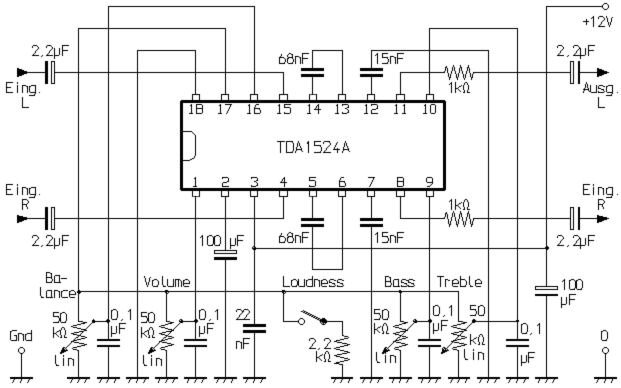 Mit dem TDA1524A als Steuereinheit für die Bass-, Höhen-, Volume- und Balance-Einstellung konnte auch hier der Aufwand klein gehalten werden. Vorteilhaft ist bei dieser Schaltung, dass nur Mono-Potis mit linearer Einstell-Charakteristik benötigt werden. Außerdem ist der Verdrahtungs-Aufwand zur Frontplatte minimal. Da die Einstellungen ausschließlich über Steuer-Gleichspannungen erfolgen, brauchen die Leitungen nicht abgeschirmt werden. Das IC bietet auch die Möglichkeit einer Kontur/Loudness-Funktion (gehörrichtige Lautstärke), von der im vorhandenen Gerät aber kein Gebrauch gemacht wird. Der Einstell-Umfang für die Tiefen liegt im Bereich von -19 bis +17dB. Die Höhen lassen sich in einem Bereich von ± 15dB verstellen. |